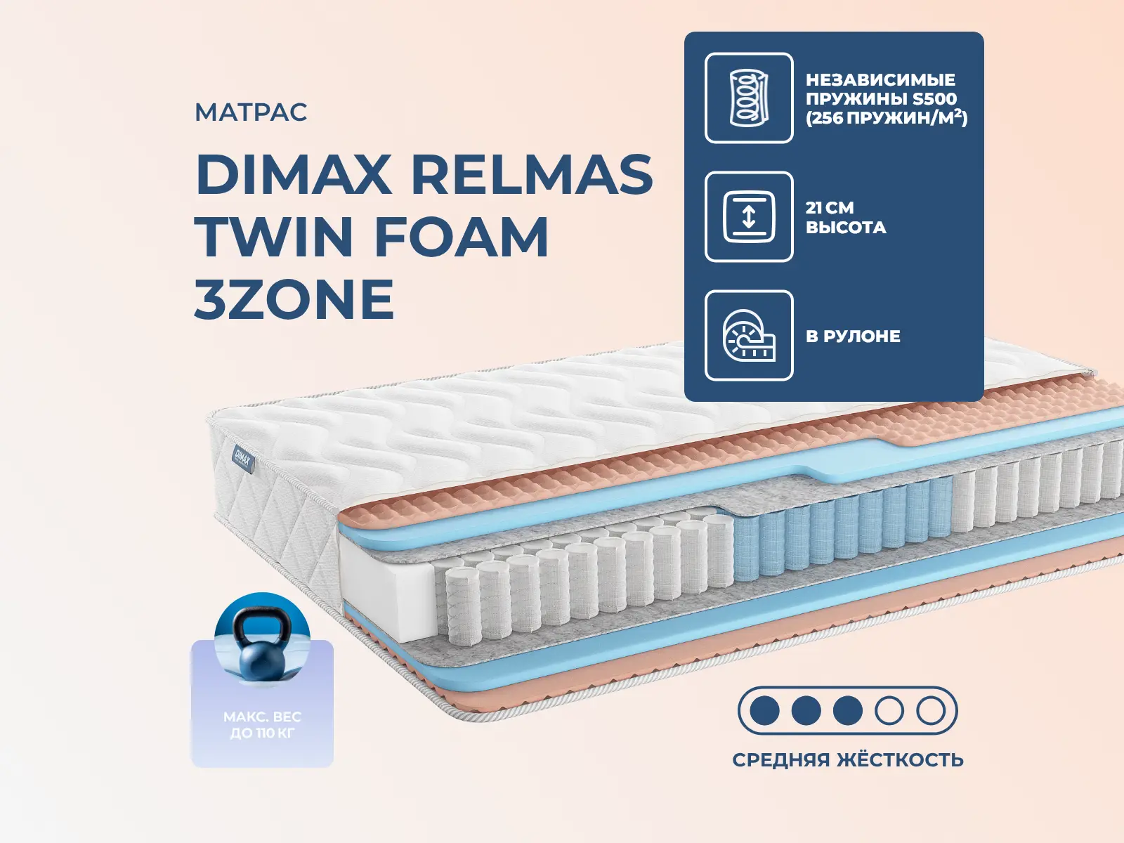 Высота: 21 см. Несъемный чехол Relax CoverМягкий трикотажный материал, структура которого представляет соединённые между собой петли. Именно такая структура придает чехлу удивительную мягкость и эластичность. Пышная объемная стежка в форме волны придает матрасу привлекательный внешний вид, а в совокупности с наполнителем Massage Foam создает непревзойденный комфорт и специальный массажный эффект.Преимущества материала Massage FoamПена с высокой точностью подстраивается под изгибы тела и обеспечивает правильное положение позвоночника во время сна.Ячеистая структура пены обладает отличной воздухопроницаемостью, сохраняя оптимальный микроклимат спального места. Рельефная поверхность деликатно воздействует на мягкие ткани и способствует максимальному расслаблению перед сном. Пружинный блокВ центре модели установлен блок пружин 3 level comfort zone. Он защищён с обеих сторон полотнами термовойлока. Система имеет сразу три зоны жёсткости для того, чтобы более органично и правильно поддерживать все области фигуры спящего. Механизм относится к категории независимых, что означает качественную точечную подстройку системы с помощью многочисленных пружин. Автономность блока обеспечивает матрасу анатомические функции и устойчивость к существенным нагрузкам.Скрутка в рулонПо умолчанию матрас поставляется в развернутом виде. По вашему желанию матрас может быть доставлен в скрученном виде.При доставке транспортной компанией матрас всегда скручивается в рулон. Хранение матрасов в скрутке должно осуществляться: