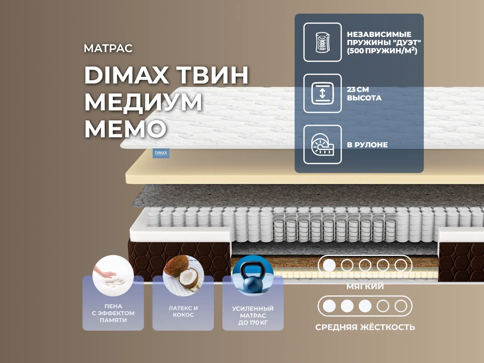 Уровень жесткости: мягкий/средний. Особенности работы пружин Twin PocketОсобенность этой модели является его основа – пружинный блок «пружина в Пружине». Это интересная конструкция, которая идеально подходит для пар с большой разницей в весе. В таком блоке два вида пружины и одна заключена в другую. Пружины с меньшим диаметром работают, когда ложится партнер с большим весом, а для партнера с весом ниже среднего работают пружины большего диаметра. Такой блок очень надежный и прочный, способен выдерживать большие нагрузки.Мягкий расслабляющий материалМодель имеет две стороны, то есть две спальные поверхности: одну мягкую, а другую средне-жесткую. Мягкая сторона выполнена на основе уникального материала с эффектом памяти формы. Это материал с вязкоэластичной структурой, который обладает способностью прогибаться под весом спящего и под действием от его температуры запоминать его очертания и сохранять их как отпечаток. Материал очень комфортный, он хорошо вентилируется и абсолютно безопасен для здоровья.Сочетание кокоса и латексаС другой стороны проложена кокосовая койра и натуральный латекс. Это натуральные наполнители. Кокос – это спрессованные волокна кокосовой пальмы. Они быстро сохнут и обеспечивают постоянный воздухообмен в изделии. Жесткий кокос оказывает надежную поддержку позвоночнику. Латекс – мягкий материал, который оказывает расслабляющее действие, он гипоаллергенный и не имеет запаха.Чехол из трикотажаЧехол матраса выполнен из мягкого трикотажа со стёжкой по ППУ и холлкону, что позволяет спальной поверхности быть очень упругой, воздушной и супер-комфортной.Боковая часть обивки выполнена из мебельной ткани коричневого цвета. Ткань усиливает прочность и долговечность обивки. Такой чехол будет не только защищать ваш матрас от пыли и загрязнений, но и создавать приятную атмосферу для здорового и комфортного сна. Высота матраса составляет 23 см. Защита матрасаДля защиты поверхности от пятен от пролитых жидкостей, грязи и пыли рекомендуем купить дополнительно защитный защитный чехол или водонепроницаемый наматрасник.Другие моделиПосмотрите также другие модели этой серии: Dimax Твин Мемо Хард, Dimax Твин Медиум Софт.Скрутка в рулонПо умолчанию матрас поставляется в развернутом виде. По вашему желанию матрас может быть доставлен в скрученном виде.При доставке транспортной компанией матрас всегда скручивается в рулон. Хранение матрасов в скрутке должно осуществляться: