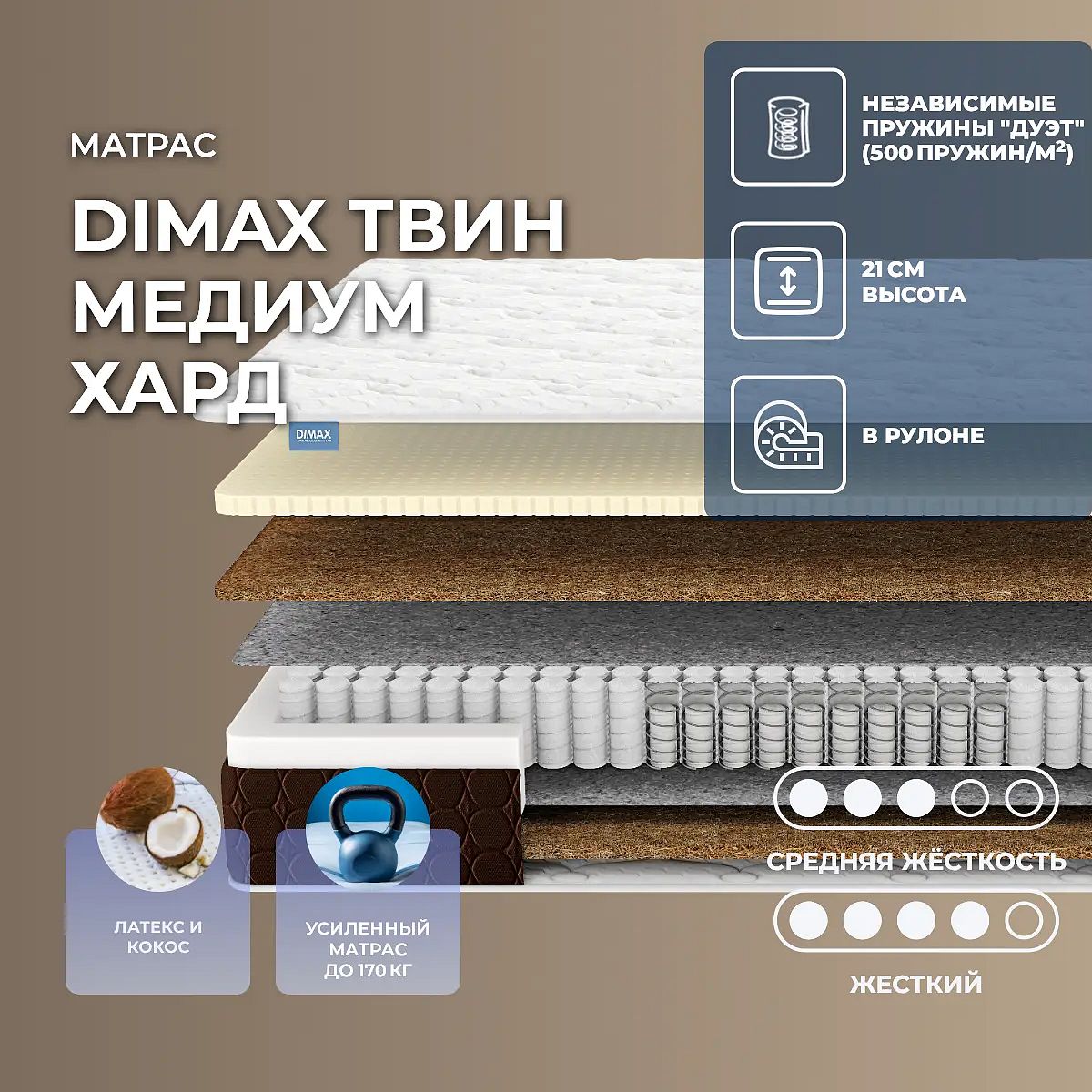 Уровень жесткости: средний/высокий. Особенности работы пружин Twin PocketГлавная особенность модели – наличие в блоке двойных пружин. Пружина покороче и потолще вставлена в пружину подлиннее и потолще. Когда спящий среднего веса ложится на поверхность такого блока, то прогибаются более длинные пружины, когда это человек с весом выше среднего, тогда начинает работать пружина покороче. Таким образом, такой пружинный блок идеален для пар с большой разнице в весе.Две стороны моделиДругая особенность модели – двустороннее наполнение и наличие двух спальных поверхностей, что заметно экономит средства и расширяет возможности, поскольку можно использовать как одну, так и другую сторону. В модели одна сторона жесткая, другая помягче.Жесткая поддержка кокосаЖесткая сторона выполнена на основе гипоаллергенного материала – кокосовой койры. Она изготавливается из спрессованных кокосовых волокон, для придания эластичности волокнам их пропитывают соком латекса. Получается очень прочный и гибкий материал, который не боится нагрузок. Кокос создает мощную основу для позвоночника, позволяет телу расслабляться и принимать естественное положение во сне.Сочетание кокоса и латексаСредне-жесткая сторона представлена сочетанием все того же кокоса и натурального латекса. Латекс – также природный материал, получаемый из млечного сока бразильского дерева Гевея. Он очень эластичный и упругий, хорошо прогибается под телом спящего и максимально его расслабляет. Материал гипоаллергенный и не имеет запаха.Чехол из трикотажаЧехол матраса выполнен из мягкого трикотажа с изысканной стеганой отделкой, что придает ему элегантный вид. Спальные поверхности матраса наполнены комфортным ППУ и упругим холлофайбером, обеспечивая приятное ощущение мягкости и объёма.Боковые части чехла сшиты из прочной коричневой мебельной ткани и простеганы на ППУ. Бурлет усиливает обивку за счёт износоустойчивости ткани, а также придаёт спальной принадлежности стильный облик. Общая высота модели – 21 см. Защита матрасаДля защиты поверхности от пятен от пролитых жидкостей, грязи и пыли рекомендуем купить дополнительно защитный защитный чехол или водонепроницаемый наматрасник.Другие моделиПосмотрите также другие модели этой серии: Dimax Твин Медиум Софт, Dimax Твин Медиум.Скрутка в рулонПо умолчанию матрас поставляется в развернутом виде. По вашему желанию матрас может быть доставлен в скрученном виде.При доставке транспортной компанией матрас всегда скручивается в рулон. Хранение матрасов в скрутке должно осуществляться: