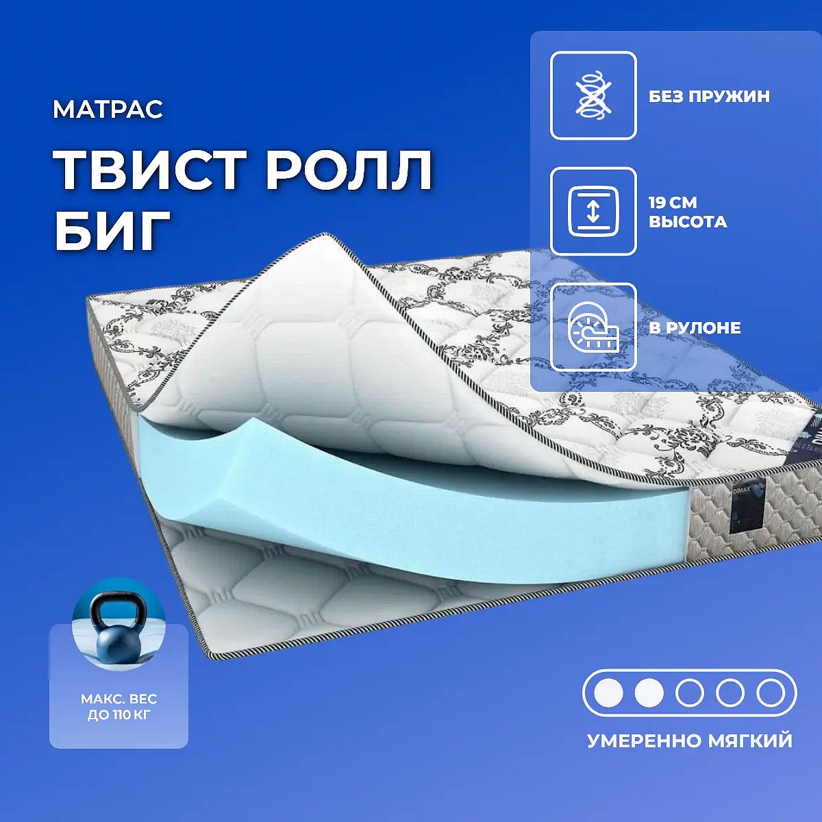Матрас Твист Ролл Биг рассчитан на нагрузку не более 110 кг на одно спальное место.