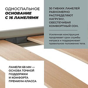 Каркас основания Regular изготовлен из металла.Размер профиля рамы 46х35 мм. На одно спальное место приходится 16 буковых ламелей шириной по 68 мм. В центральной зоне предусмотрена регулировка жесткости ламелей. Высота каркаса: 4,6 см. В состав основания входят вкручивающиеся ножки с противоскользящим основанием.