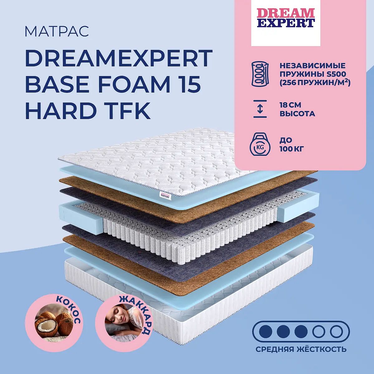 Матрас «DreamExpert Base Foam 15 Hard TFK» — средней жесткости, которая подходит большинству людей среднего телосложения. Это — универсальный выбор и детям, и взрослым, и пожилым людям.