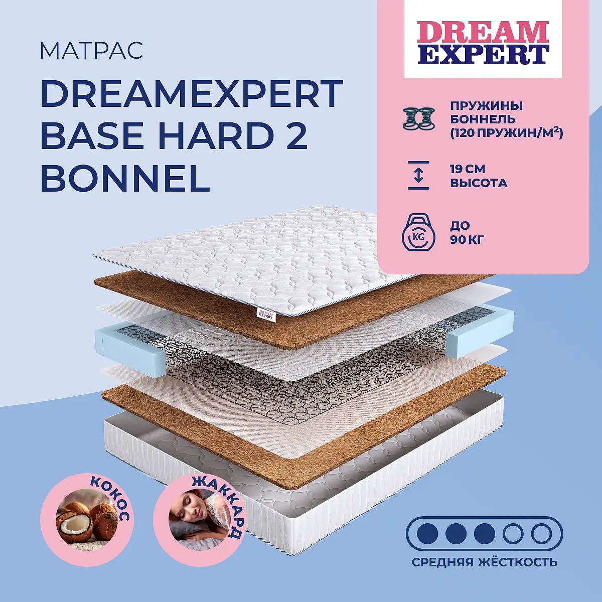 Матрас «DreamExpert Base Hard 2 Bonnel» — средней жесткости, которая комфортна большинству людей среднего телосложения. Это — универсальный выбор и детям, и взрослым, и пожилым людям.