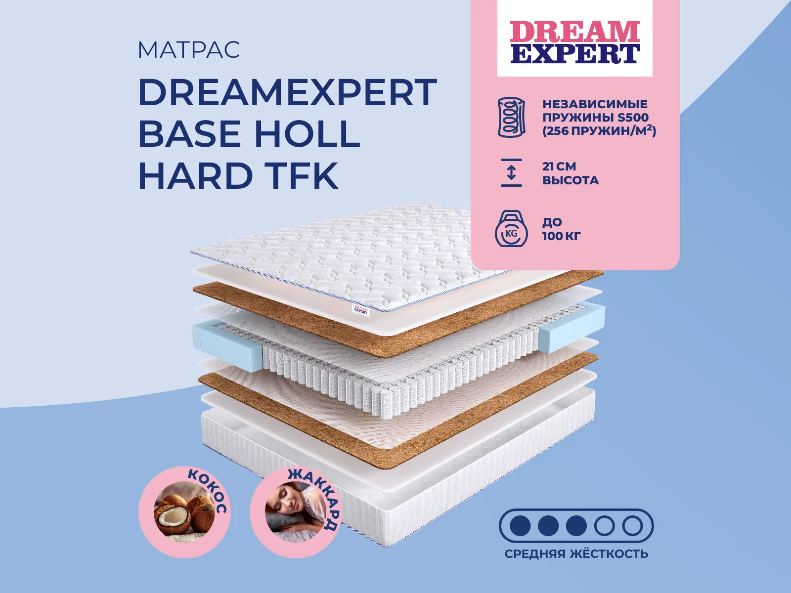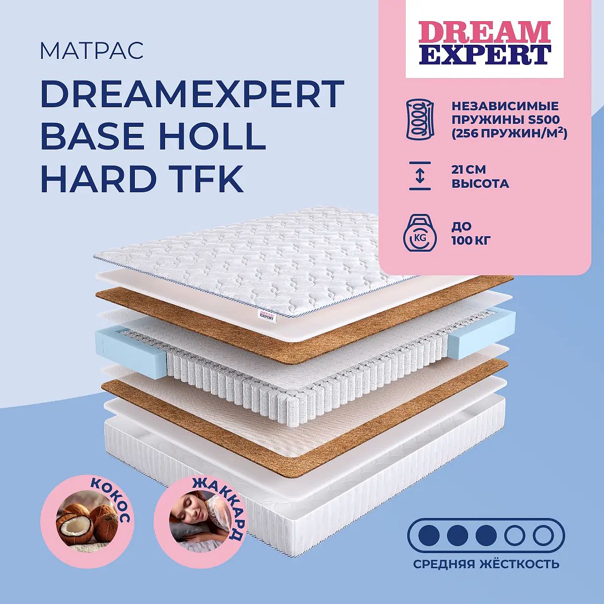 Матрас «DreamExpert Base Holl Hard TFK» — средней жесткости, которая комфортна большинству людей среднего телосложения. Это — оптимальный вариант и детям, и взрослым, и пожилым людям.