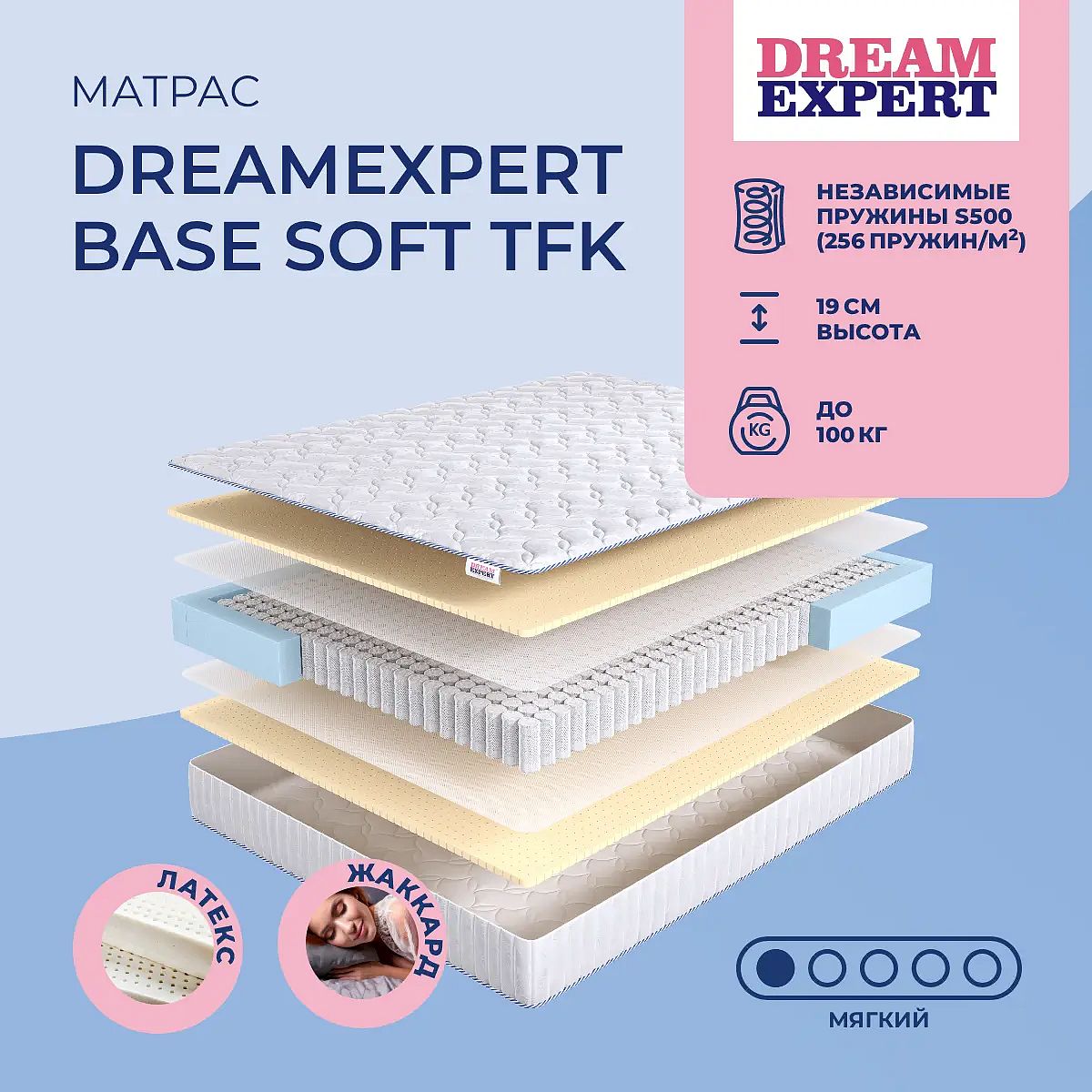 Матрас DreamExpert Base Soft TFK — мягкий пружинный матрас высотой 19 см для комфортного сна. Благодаря сочетанию натурального латекса и независимого пружинного блока TFK с плотностью 256 пружин на м2, матрас обеспечивает точечную поддержку тела и приятную мягкость. Одинаковая мягкость обеих сторон делает его удобным для смены положения и регулярного переворачивания. Латексные слои по 20 мм с обеих сторон способствуют поддержанию упругости и эластичности, а синтетический жаккардовый чехол с простёжкой на синтепоне (100 г) устойчив к износу и сохраняет аккуратный внешний вид. Максимальная нагрузка на одно спальное место — до 100 кг. Ключевые особенности
