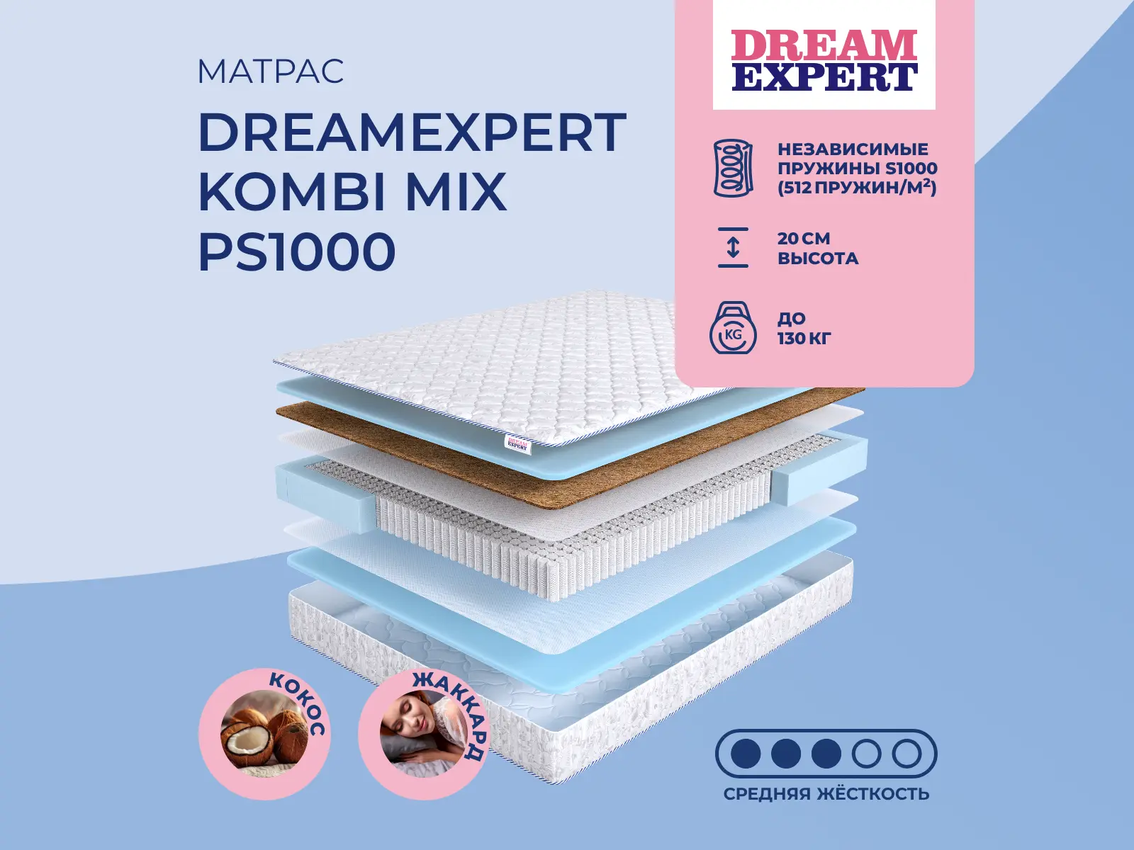 Матрас «DreamExpert Kombi Mix PS1000» — средней жесткости, которая комфортна большинству людей среднего телосложения. Это — оптимальный вариант и детям, и взрослым, и пожилым людям.