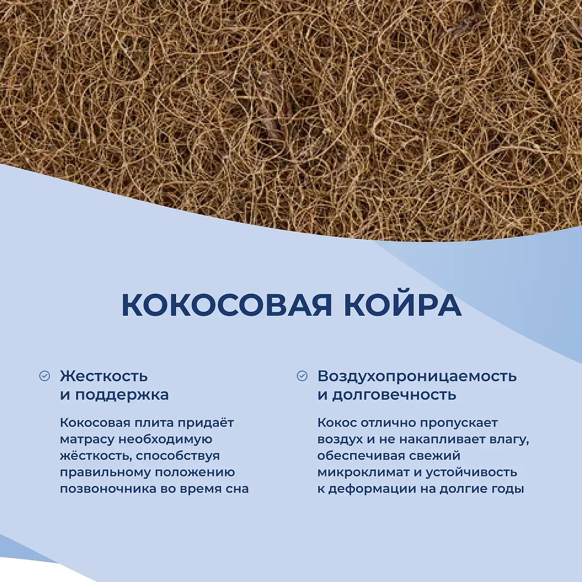 Кокос — натуральный материал, койра отлично дышит, придает матрасу «Natural Hard 1 PS1000» жесткость и упругость.