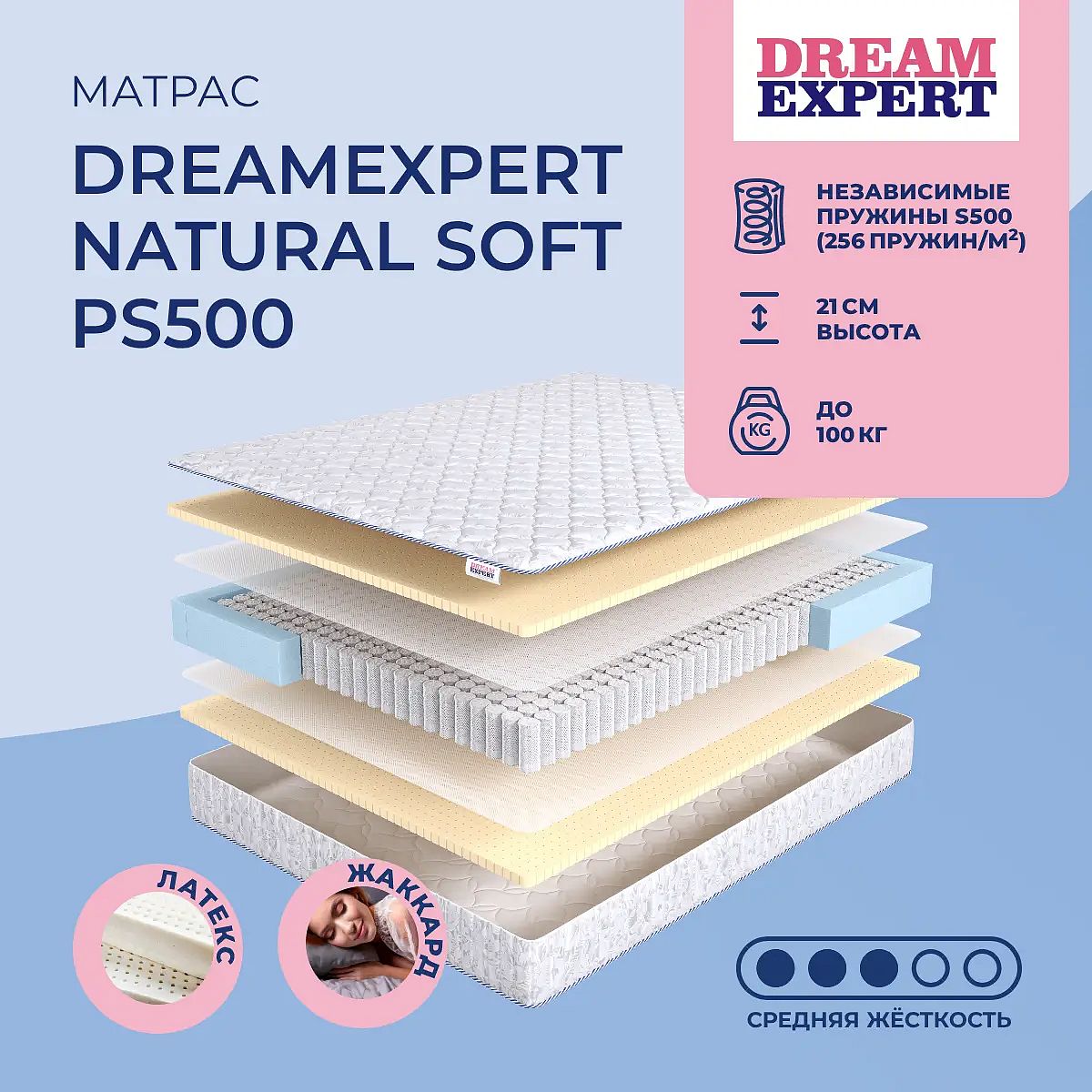 Матрас «DreamExpert Natural Soft PS500» — средней жесткости, которая подходит большинству людей среднего телосложения. Это — оптимальный вариант и детям, и взрослым, и пожилым людям.