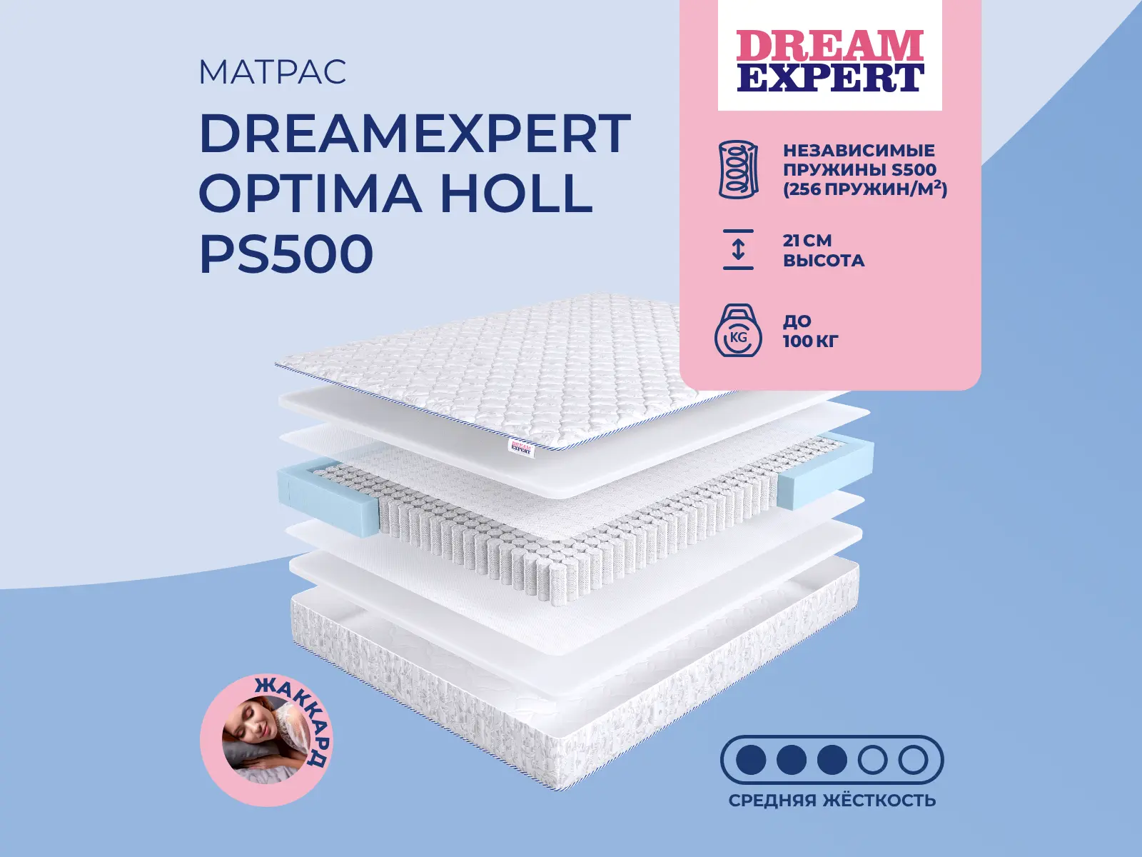 Матрас «DreamExpert Optima Holl PS500» — средней жесткости, которая подходит большинству людей среднего телосложения. Это — оптимальный вариант и детям, и взрослым, и пожилым людям.