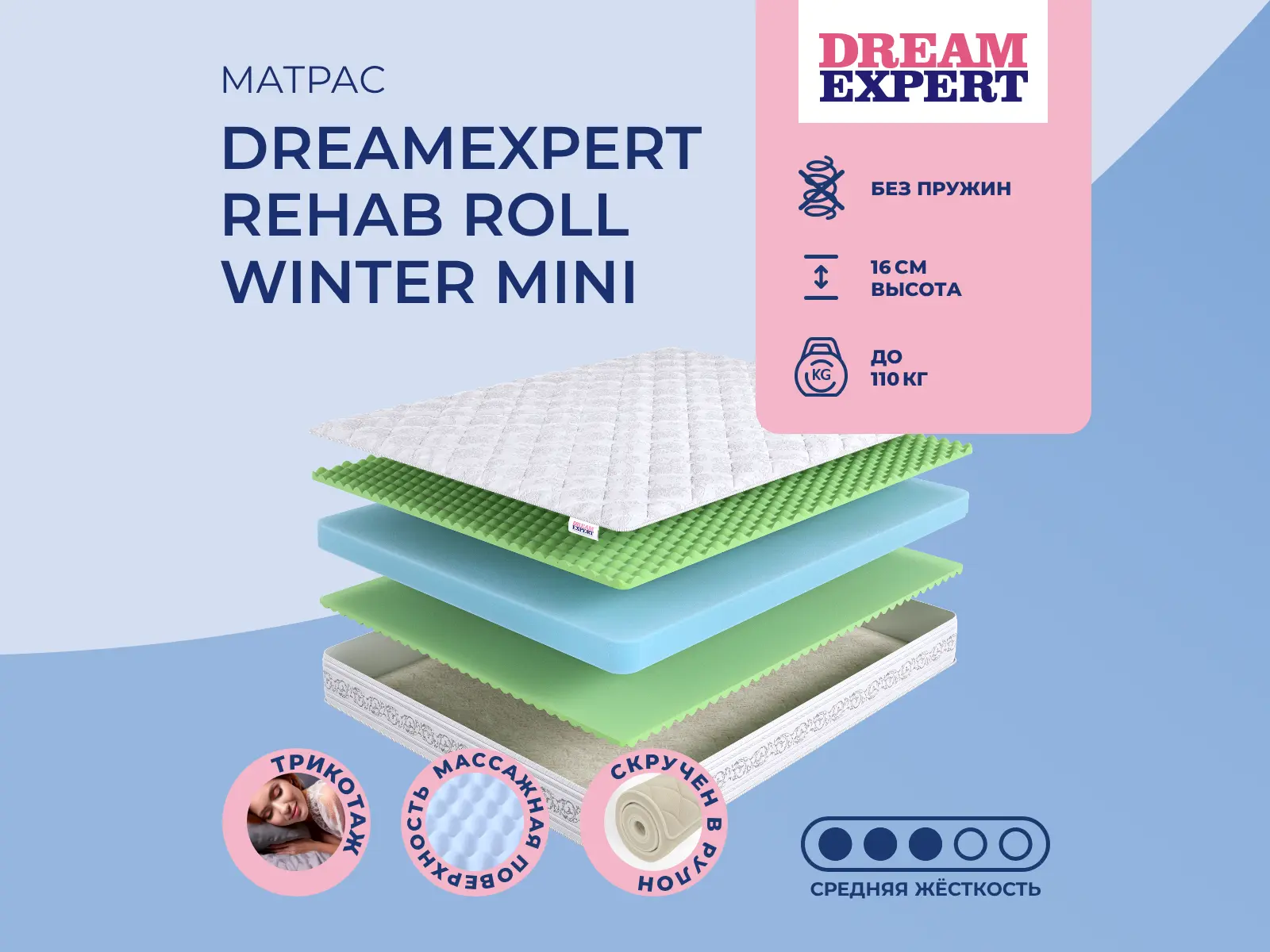 Матрас «DreamExpert Rehab Roll Winter Mini» — средней жесткости, которая комфортна большинству людей среднего телосложения. Это — оптимальный выбор и детям, и взрослым, и пожилым людям.