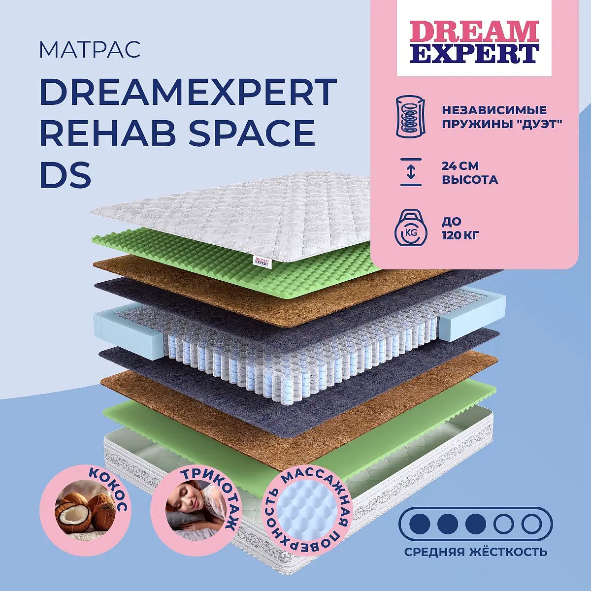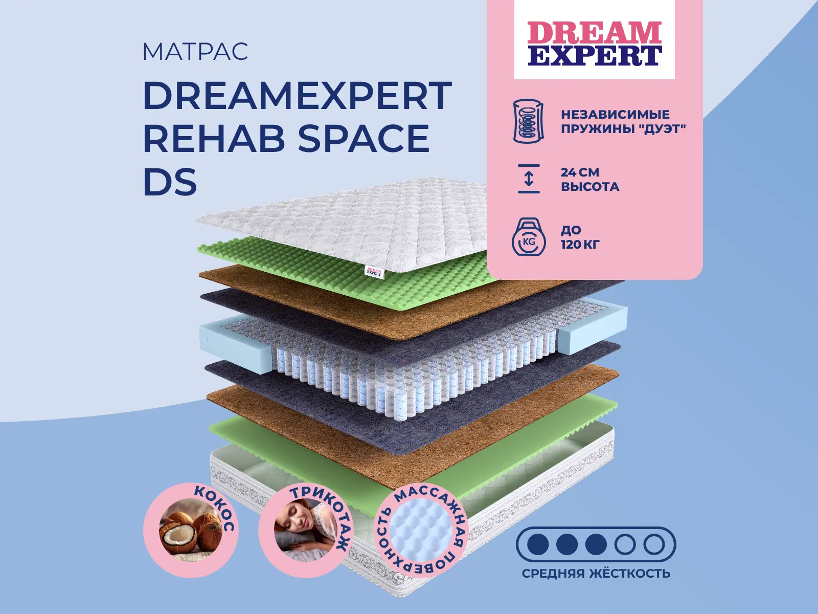 Матрас «DreamExpert Rehab Space DS» — средней жесткости, которая подходит большинству людей среднего телосложения. Это — универсальный выбор и детям, и взрослым, и пожилым людям.