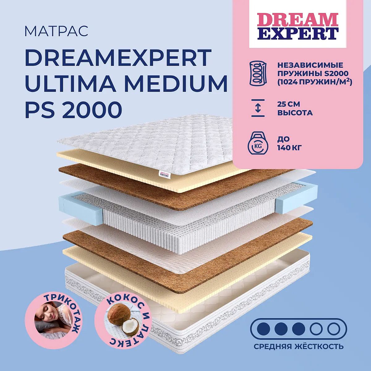 Матрас «DreamExpert Ultima Medium PS 2000» — средней жесткости, которая комфортна большинству людей среднего телосложения. Это — оптимальный выбор и детям, и взрослым, и пожилым людям.