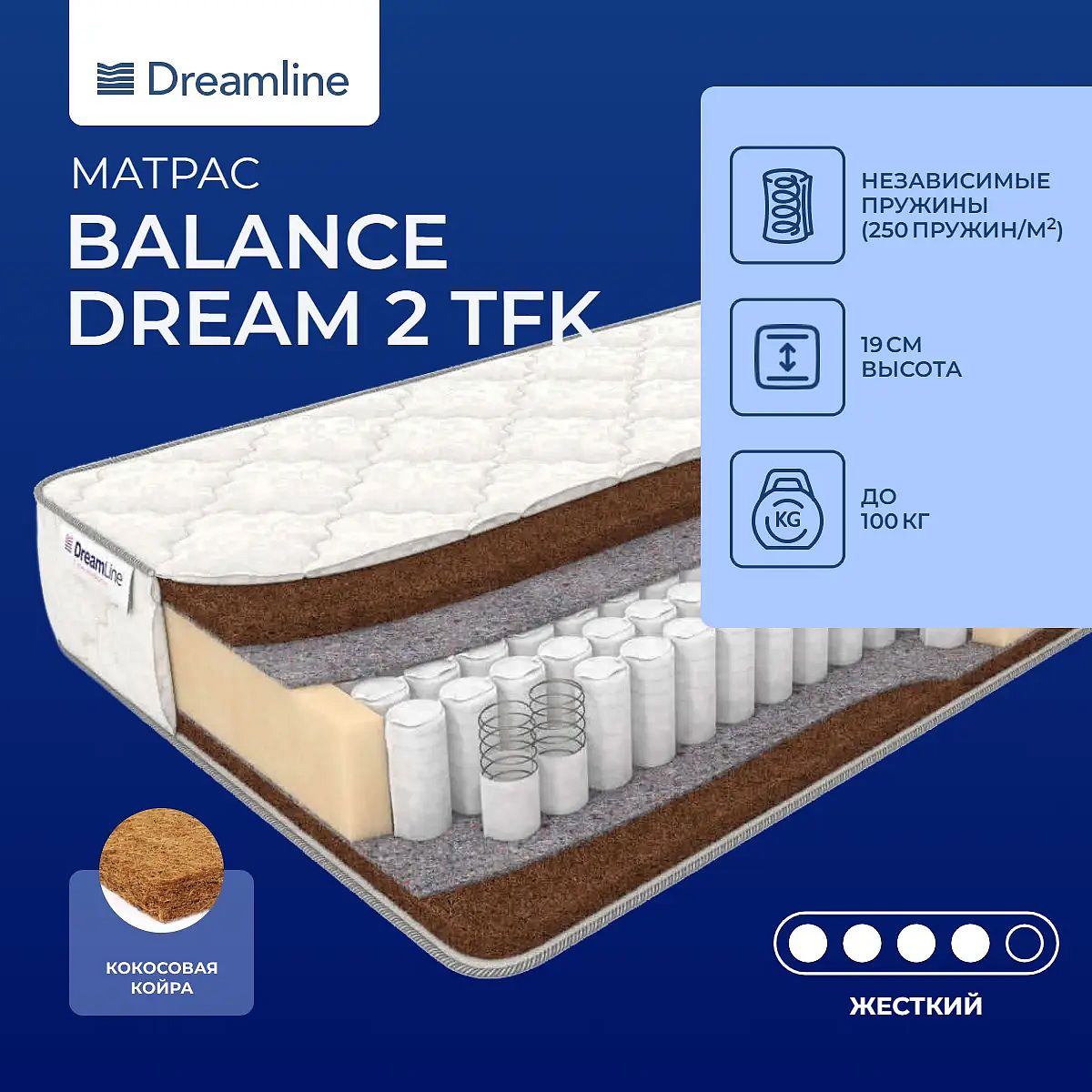 Матрас из кокосовой койры на пружинах TFK. Экологичный наполнительЖесткая поверхность матраса создается за счет слоя кокосовой койры. Это экологически чистый материал природного происхождения, прочный и износостойкий.Автономные пружиныПружинный блок представляет собой 250 микропружин цилиндрической формы на один кв. метр. Каждая помещена в отдельный тканевый чехол и работает автономно. Все чехлы соединены между собой, что обеспечивает прочность и износостойкость всей конструкции.Чехол из жаккардаЧехол модели выполнен из плотного хлопкового жаккарда.Защита матрасаДля защиты поверхности матраса от пятен и пыли незаменимым будет защитный наматрасник-чехол или водонепроницаемый наматрасник. Он сохранит поверхность свежей и продлит срок службы самого матраса.Другие моделиМодель умеренно-жесткая, также вы можете посмотреть похожую модель - Dreamline Holl Hard TFK. Ели вы хотите матрас помягче, тогда посмотрите матрас Dreamline Дачный.