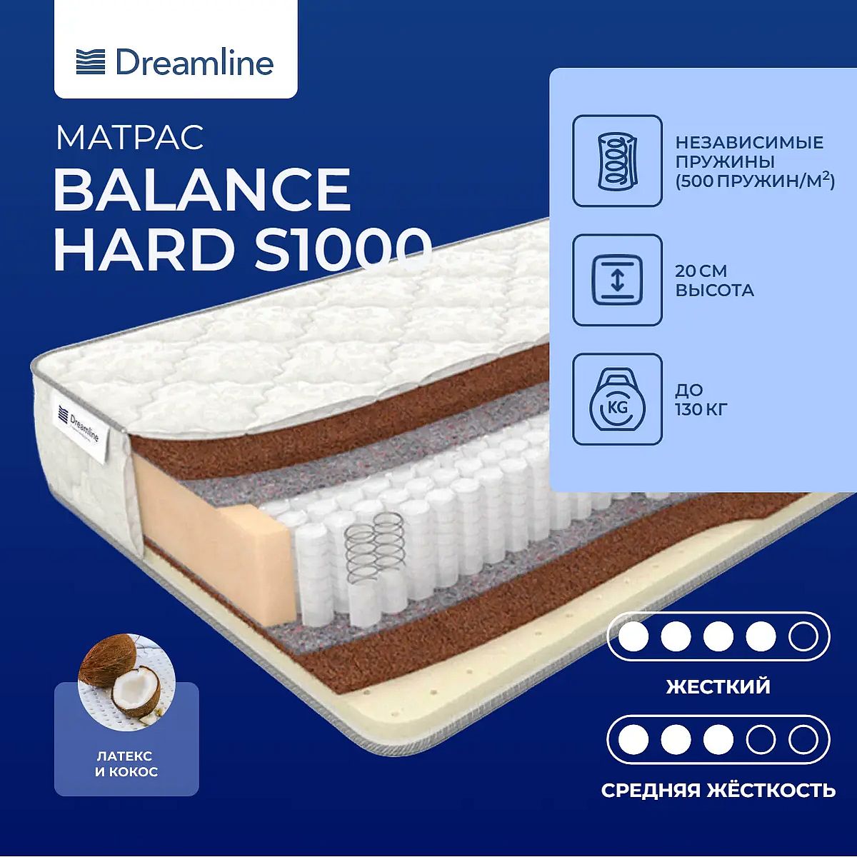 Модель с двусторонним наполнением на пружинах S1000. 1000 микропружинокОснову модели составляет блок независимых пружин. В его составе на одно спальное место приходится 1000 микропружинок в форме цилиндров. Каждый такой цилиндр упакован в специальный тканевый чехол из спанбонда. Благодаря такому строению пружины прогибаются отдельно друг от друга, когда на них непосредственно направлена нагрузка.Натуральный кокосС одной стороны модели проложен слой кокосовой койры. Это натуральный высокопрочный материал, который служит хорошей опорой для спины. На таком поверхности тело спящего находится в естественном положении.Упругий латексС другой стороны находятся слои слои кокосовой койры и натурального латекса. Это упругий и эластичный материал, на его поверхности тело спящего расслабляется, а благодаря пористой структуре еще и дышит.Трикотажный чехолЧехол модели выполнен из трикотажа Softech. Он комфортный и приятный на ощупь.Защита матрасаДля защиты от загрязнений, нежелательных пятен рекомендуем купить водонепроницаемый наматрасник или защитный чехол. Он сохранит поверхность чистой, а также продлит срок службы матраса.Другие моделиТакже вы можете посмотреть модель с похожим наполнением на другом пружинном блоке - Dreamline Balance Hard TFK.Подарок