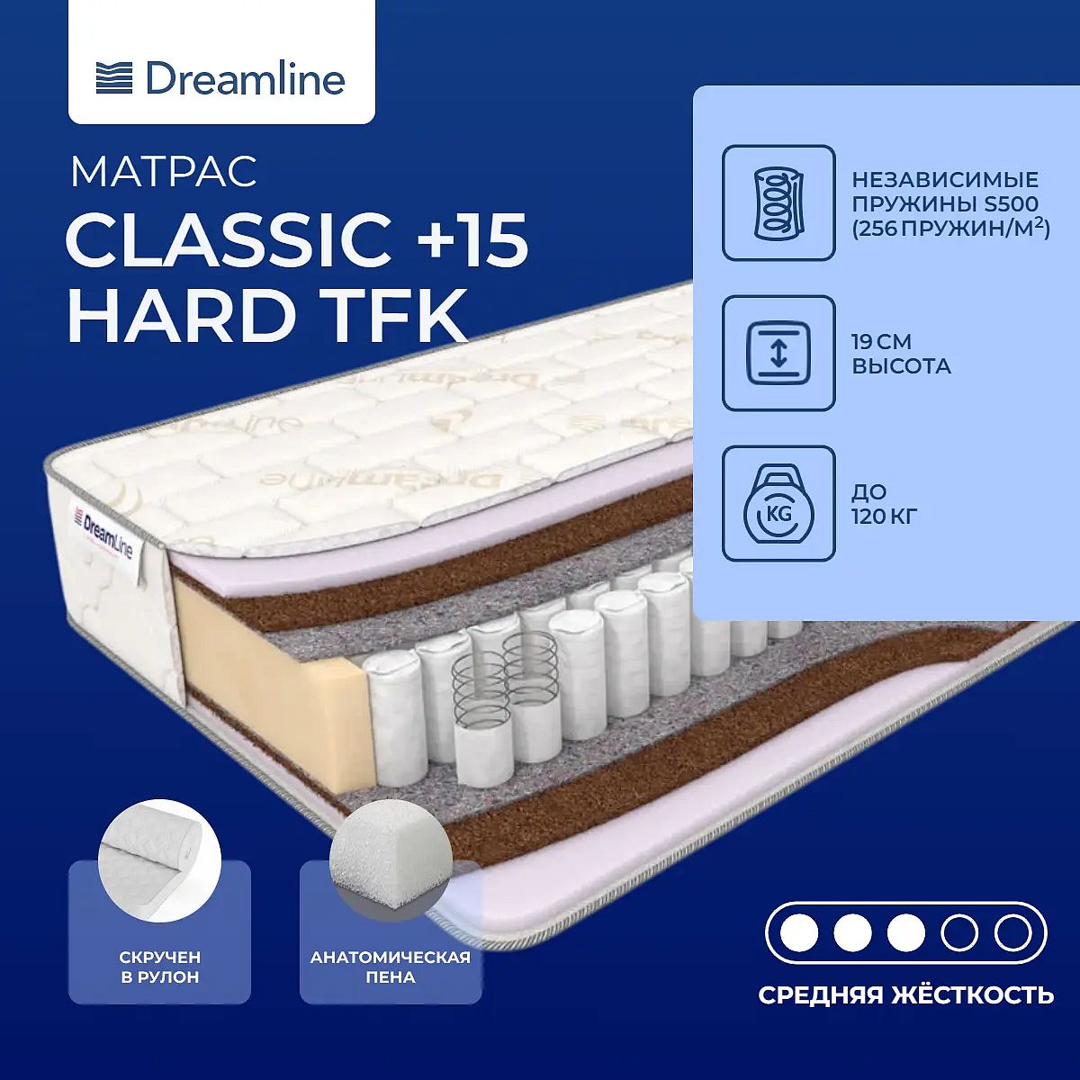 Максимальная нагрузка на спальное место: до 120 кг. Высота матраса: 19 см. Достоинства искусственного латексаИскусственный латекс – недорогой аналог натурального. Он не уступает ему по своим характеристикам: прочность, эластичность, материал хорошо пропускает воздух, и в отличии от натурального латекса, – абсолютно безвреден.Материал Poly RefineЭто очень гибкий и прочный материал. Состоит из плотно спрессованных переработанных хлопковых и синтетических волокон. Благодаря этому он обладает высокой жесткостью. Материал гипоаллергенный, дышащий и не препятствует осуществлению влаго и воздухообмену в матрасе. Его плотность 1000 г/м2, он придает матрасу жесткости и эластичности, поэтому все модели матрасов с этим материалом становятся более износостойкими, что увеличивает срок службы самого матраса.Преимущества независимого блокаМатрас изготавливается на пружинном блоке TFK,где каждая пружина изолирована от следующей и помещена в спанбондовый чехол. Поэтому исключаются притирание пружин и «эффект гамака». Все тело расслабляется, так как каждая пружинка воздействует точечно и равномерно.Чехол из жаккардаЧехол матраса сшит из хлопкового жаккарда.Скрутка в рулонПо умолчанию матрас поставляется в развернутом виде. По вашему желанию матрас может быть доставлен в скрученном виде.Защита матрасаДля того, чтобы защитить поверхность матраса от загрязнений разного рода, влаги, пыли рекомендуем приобрести также защитный чехол или водонепроницаемый наматрасник. Он сохранит поверхность чистой и продлит срок службы самого матраса.Другие моделиМодель имеет среднюю жесткость – не жесткую и не мягкую. Для любителей только мягких поверхностей подойдет также модель Dreamline Classic +15 TFK.
