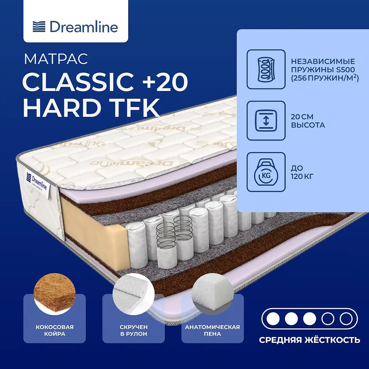 Матрас «DreamLine Classic + 20 Hard TFK» — средней жесткости, которая комфортна большинству людей среднего телосложения. Это — оптимальный выбор и детям, и взрослым, и пожилым людям.