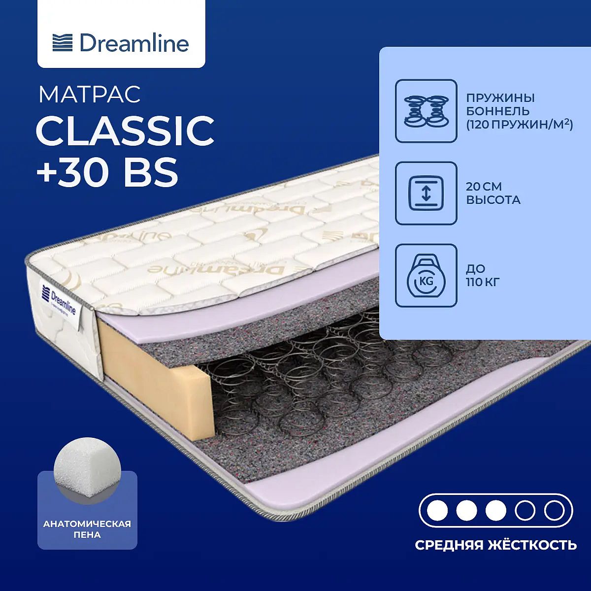 Матрас «DreamLine Classic + 30 BS» — средней жесткости, которая комфортна большинству людей среднего телосложения. Это — универсальный вариант и детям, и взрослым, и пожилым людям.