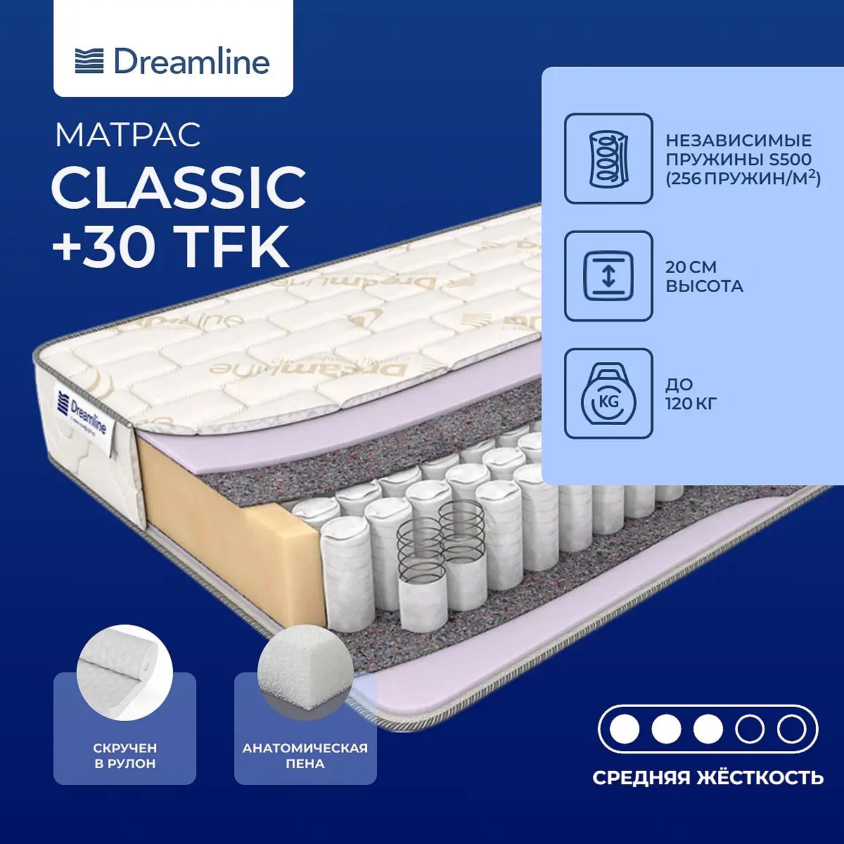 Преимущества моделиПопулярная среднежесткая модель с искусственным латексом на качественном пружинном блоке.Универсальная жесткостьМатрас имеет универсальную среднюю жесткость, то есть он не слишком жесткий и не слишком мягкий.Достоинства наполнителяВ качестве материала выбран искусственный латекс. Хороший выбор для тех, кто заботится о своем сне и при этом хочет сэкономить. Ведь, не всегда то, что дорого – полезно и удобно. Искусственный латекс обладает хорошей воздухопроводностью, он очень прочный и эластичный и не уступает по своим характеристикам натуральному латексу.Преимущества пружинного блокаМодель пружинная, в ее основе – блок независимых пружин TFK. Здесь каждая пружинка отделена от следующей и помещена в специальный чехол. Таким образом, исключается трение пружин друг об друга, нагрузка распределяется равномерно, обеспечивается максимальное расслабление во время сна. Чехол матраса изготовлен из жаккарда.Защита матрасаДля защиты поверхности матраса предусмотрен защитный наматрасник-чехол или водонепроницаемый наматрасник. Он препятствует просачиванию влаги, а также попаданию грязи и пыили внутрь матраса.Другие моделиЕсли вас интересует модель помягче со схожими характеристиками, посмотрите матрас Dreamline Classic +15 TFK.Скрутка в рулонПо умолчанию матрас поставляется в развернутом виде. По вашему желанию матрас может быть доставлен в скрученном виде.