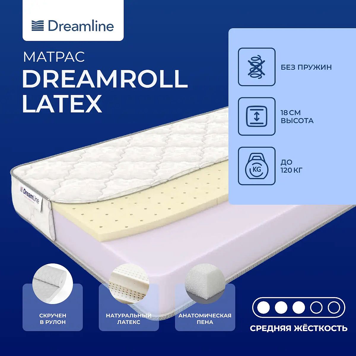 Матрас «DreamLine DreamRoll Latex» — средней жесткости, которая подходит большинству людей среднего телосложения. Это — универсальный вариант и детям, и взрослым, и пожилым людям.