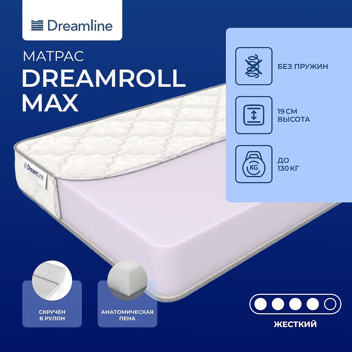 Достоинства моделиМодель достаточно высокая (19 см), в ее основе – цельный блок искусственного латекса. Этот наполнитель обеспечивает правильное положение тела на спальной поверхности и создает комфортные условия для сна.Гипоаллергенный материал в основеИскусственный латекс является гипоаллергенным, экологически чистым материалом, он способен выдерживать большие нагрузки и не деформируется со временем.Пористая стуктураБлагодаря структуре из множества микропор изделие способно пропускать воздух, а значит, свежесть во время сна вам гарантирована.Комфортный чехолЧехол из хлопкового жаккарда обеспечит вам дополнительный комфорт и подарит свежесть. Модель относится к линейке скрученных, следовательно, матрас удобно перевозить, даже в салоне автомобиля.Защита матрасаДля дополнительной защиты от пыли, грязи и влаги рекомендуем докупить защитный или водонепроницаемый наматрасник.Другие моделиЭта модель умеренно-жесткая, если вас интересует модель помягче, тогда обратите внимание на матрас Dreamline DreamRoll Eco.Скрутка в рулонПо умолчанию матрас поставляется в скрученном виде.