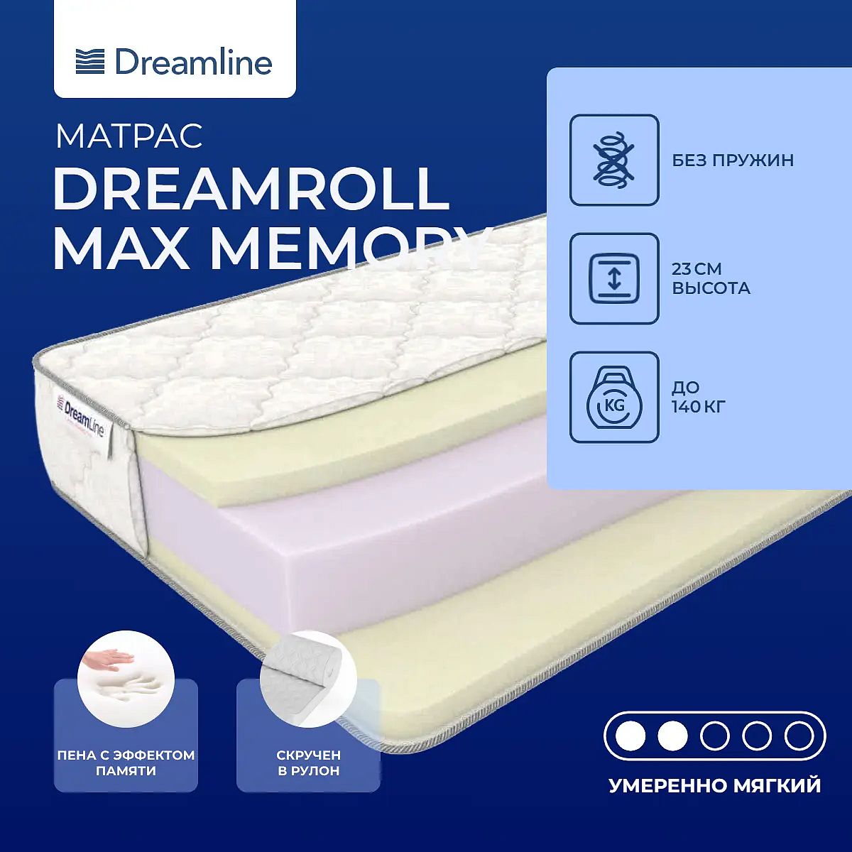 Матрас Dreamline DreamRoll Max Memory — современное решение для комфортного сна без пружин. Модель умеренно мягкая с обеих сторон. В основе матраса — инновационные материалы: два слоя пены с эффектом памяти (мемориформ) по 4 см с каждой стороны и 14 см искусственного латекса в середине. Такая конструкция обеспечивает приятную мягкость, поддержку и равномерное распределение нагрузки. Высота матраса составляет 23 см, что позволяет использовать его на большинстве кроватей стандартной высоты. Максимальная нагрузка — до 140 кг на спальное место. Ключевые особенности