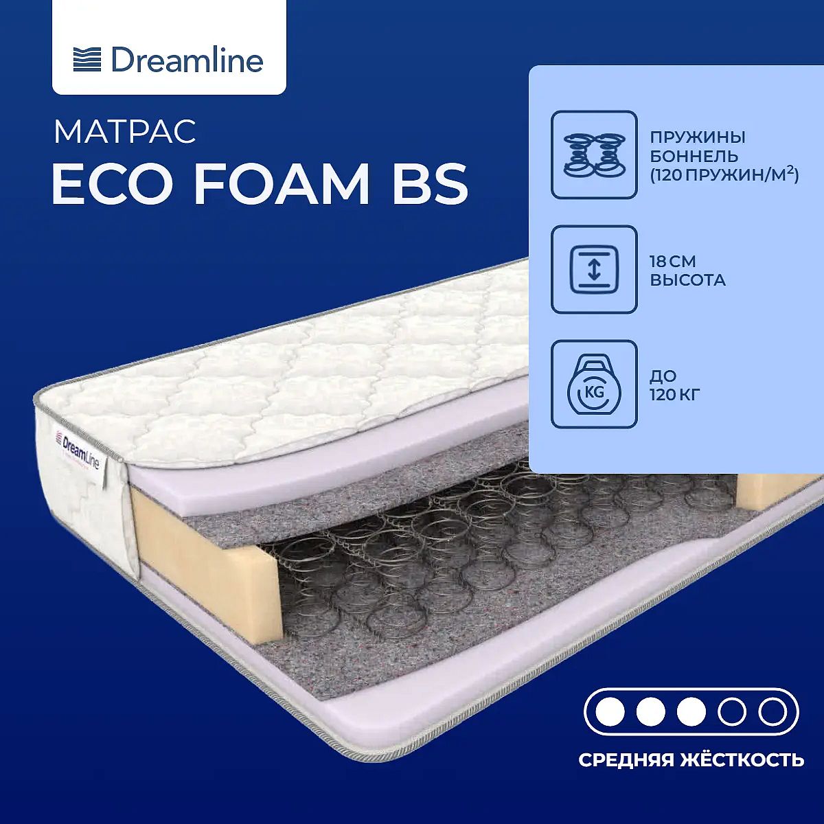 Конусные пружиныМодель на классическом пружинном блоке «Боннель». Конструкцию составляют конусные винтовые пружины, соединенные определенным образом так, что все они оказываются связанными. Изготавливаются эти пружины из прочной стальной проволоки. Блок характеризуется надежностью и прочностью.Изолирующий слойПо обеим сторонам пружинного блока располагаются слои термовойлока. Этот материал служит изоляционным слоем между пружинами и слоями матраса.Умеренно-мягкий наполнительМодель умеренно-мягкая, полностью состоящая из слоев искусственного латекса. Это недорогой материал повышенной плотности, он хорошо гнется и не ломается. Абсолютно безопасный для здоровья.Чехол моделиВерхний слой матраса обернут в чехол из хлопковой ткани.Защита матрасаДля защиты матраса от загрязнений, влаги, пыли рекомендуем купить защитный наматрасник-чехол или водонепроницаемый наматрасник.Другие моделиЕсли вас интересует модель пожестче, тогда рекомендуем посмотреть матрас Dreamline Eco Hol Bonnel.