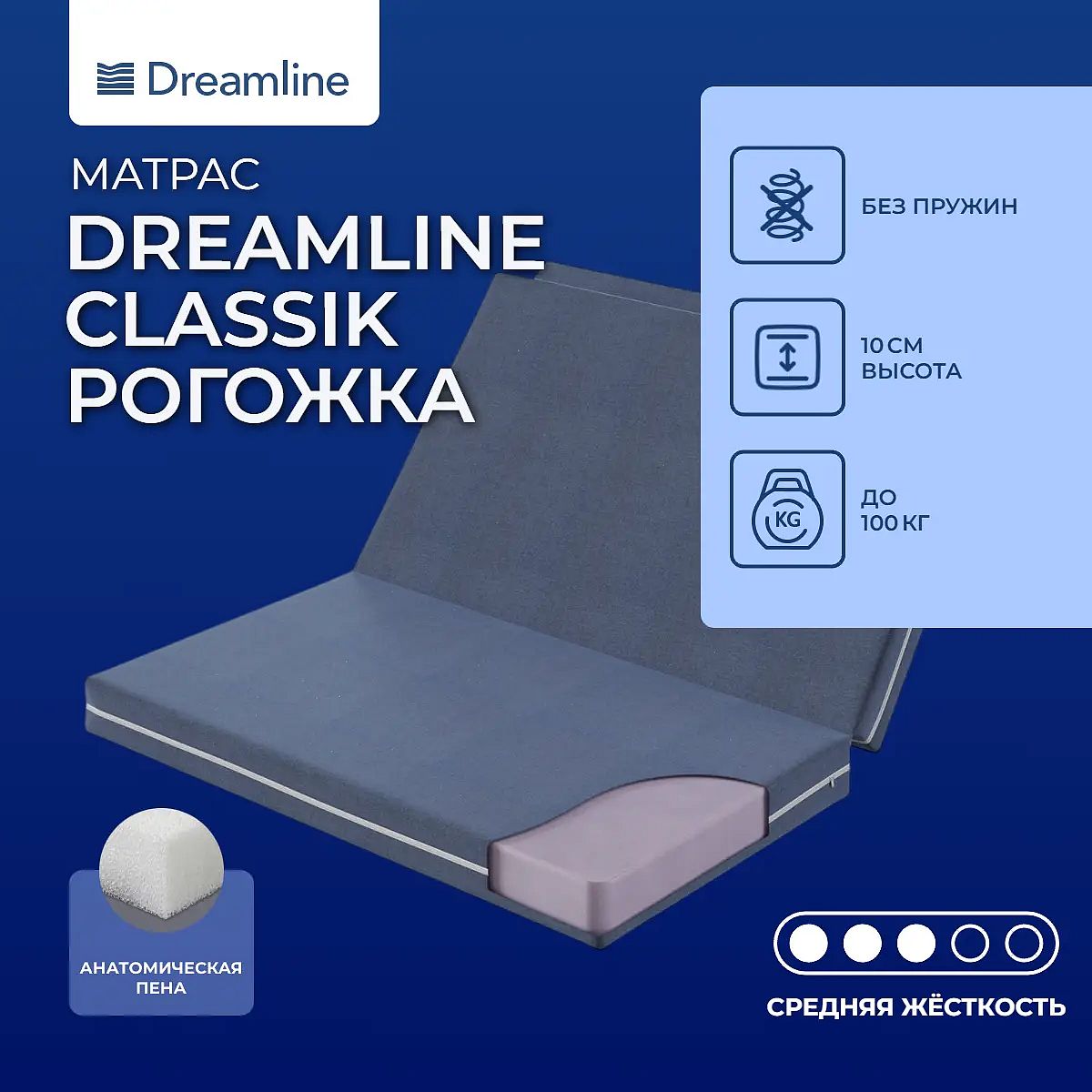 Матрас «DreamLine Classik рогожка» — средней жесткости, которая подходит большинству людей среднего телосложения. Это — универсальный выбор и детям, и взрослым, и пожилым людям.