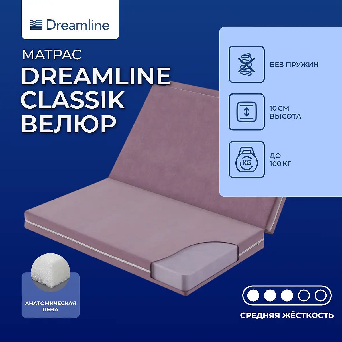 Матрас «DreamLine Classik велюр» — средней жесткости, которая подходит большинству людей среднего телосложения. Это — универсальный вариант и детям, и взрослым, и пожилым людям.