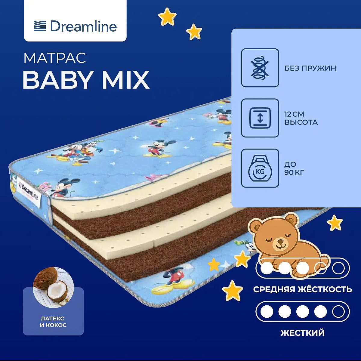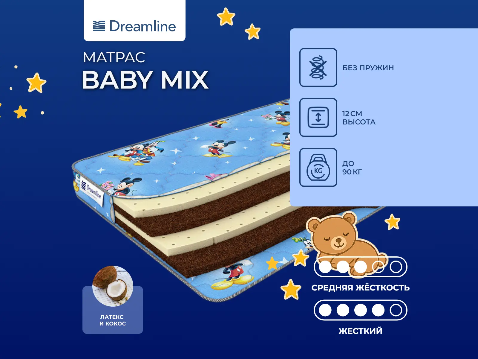 Нагрузка, кг: 90. Высота, см: 12. *Расцветка чехла матраса может отличаться от представленной на фото и зависит от наличия ткани у производителя. Наполнение моделиМодель не имеет пружинного блока в основе, материалами ее служат натуральный латекс и природный материал кокосовая койра. Оба наполнителя гипоалергенные и не способны вызвать аллергические реакции у ребенка. Кокос с одной стороны делает поверхность более жесткой и анатомичной. Материал создает надежную основу для еще не окрепшего позвоночника ребенка, создает постоянный воздухообмен на поверхности, в результате чего малыш не перегревается во время сна. Натуральный латекс с другой стороны создает более упругую и мягкую поверхность, на которой малыш может расслабиться, латекс способен снимать мышечные напряжения и восстанавливать кровоток, а также снимать болевые ощущения.Гипоаллергенный чехолЧехол модели представляет собой бязь, простеганную на гипоаллергенном холлконе. Чехол имеет рисунок.Защита матрасаДля защиты от загрязнений, нежелательных пятен рекомендуем купить защитный наматрасник или водонепроницаемый чехол. Он сохранит поверхность чистой, а также продлит срок службы матраса.Другие моделиТакже вы можете посмотреть другие детские модели: Dreamline Baby Latex TFK, Dreamline Baby Mix Slim.