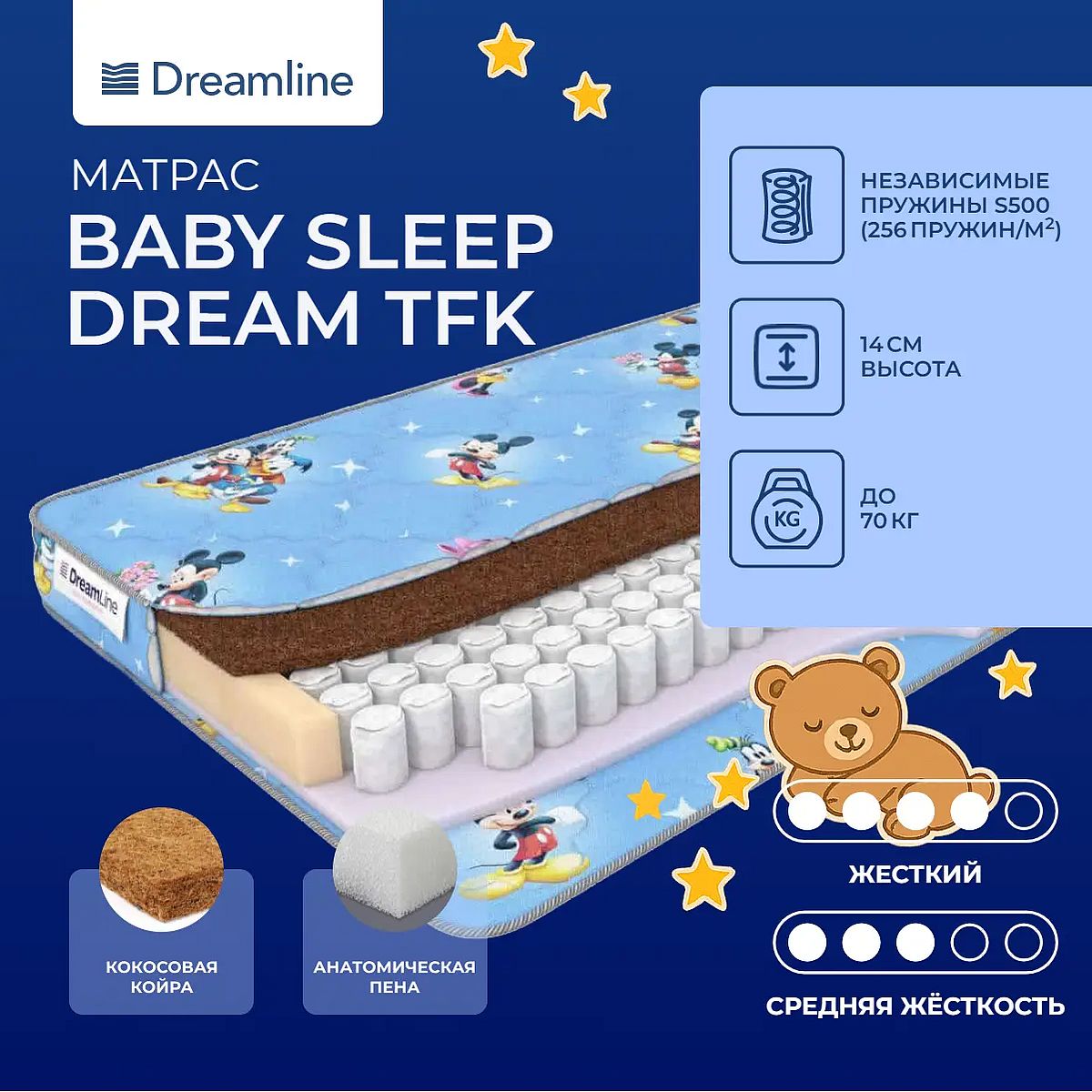 Нагрузка, кг: 70. Высота, см: 14. *Расцветка чехла матраса может отличаться от представленной на фото и зависит от наличия ткани у производителя. Особенности работы пружин TFKВ основе этой модели проложен блок независимых пружин TFK. В такой конструкции по 256 пружин на 1 кв. метр. Пружины отделены друг о друга и действуют самостоятельно. Когда ребенок садится на такой матрас, прогибается ровно то место, на которое направлена нагрузка. Это позволяет нагрузке во время сна распределяется равномерно по всей поверхности блока.Наполнение моделиМодель имеет асимметричные стороны: одна выполнена на основе кокосовой койры - это жесткая сторона, другая - на основе искусственного латекса – эта сторона менее жесткая и более упругая. Кокосовая сторона создает надежную опору для позвоночника ребенка, позволяет формировать ее, также определяет естественные позы во время сна. Кокос хорошо вентилируется и не дает ребенку перегреваться на спальной поверхности. Искусственный латекс обеспечивает упругую поддержку для всего тела, позволяет ему расслабиться и восстановить силы. Оба материала являются безопасными для сна и здоровья ребенка.Гипоаллергенный чехолЧехол модели представляет собой бязь, простеганную на гипоаллергенном холлконе. Чехол имеет рисунок.Защита матрасаДля защиты от загрязнений, нежелательных пятен рекомендуем купить защитный наматрасник или водонепроницаемый чехол. Он сохранит поверхность чистой, а также продлит срок службы матраса.Другие моделиТакже вы можете посмотреть другие детские модели с кокосом на пружинах TFK: Dreamline Baby Dream TFK, Dreamline Baby Latex TFK.