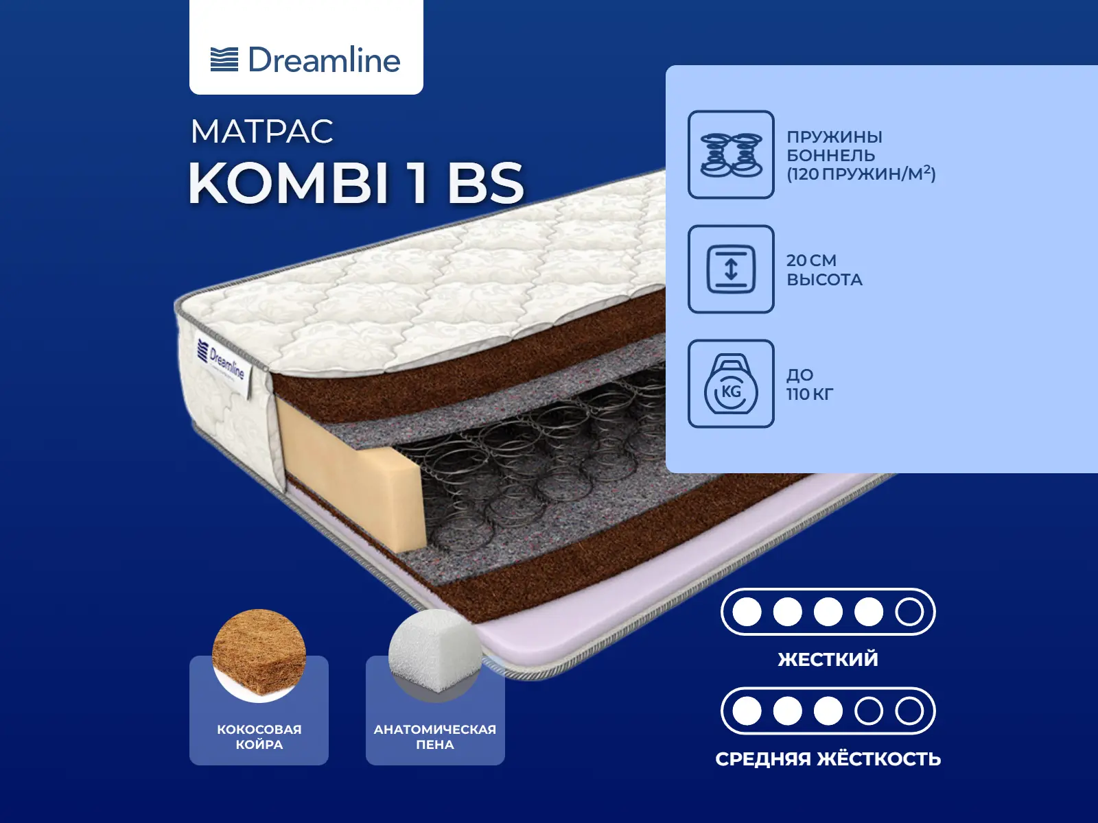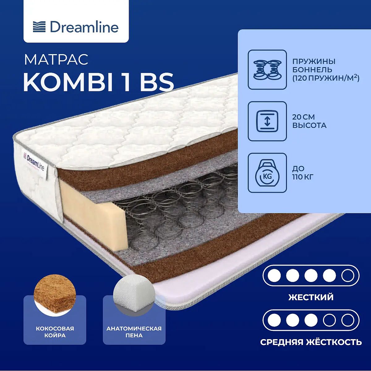Высота, см: 20. Ограничение по максимальной нагрузке, кг: 110. Наполнение моделиМодель двусторонняя, значит, имеет две спальные поверхности. Вы можете использовать то одну, то другую сторону попеременно. Одна сторона более жесткая и выполнена на основе кокосовой койры, материала очень жесткого. Он создает идеально ровную анатомическую поверхность. Кокос способствует правильному расположению тела на поверхности, формирует позвоночник и обеспечивает благоприятный климат на поверхности. Кокос гигиеничен, он хорошо проводит воздух и быстро испаряет воздух. Другая сторона изготовлена с участием кокосовой койры и искусственного латекса. Латекс смягчает кокос, делает поверхность более упругой и мягкой. Латекс способствует расслаблению, а также создает упругую поддержку для всего тела. Материал хорошо пропускает воздух и является абсолютно безопасным для здоровья.Особенности работы пружин BonnelВ основе модели проложен пружинный блок зависимого типа - «Боннель». В такой конструкции все пружины соединены друг с другом и действуют вместе. Пружины выполнены из прочного материала и обеспечивают надежную опору для всего тела. На концах пружин имеются замочки, которые предотвращают их выкручивание. Такой блок гигиеничен, он постоянно проветривается благодаря отверстиям между пружинами, также имеет весьма привлекательную цену.Жаккардовый чехолЧехол модели выполнен из хлопкового жаккарда Lux, простеганного на холлконе.Защита матрасаДля защиты от загрязнений, нежелательных пятен рекомендуем купить защитный наматрасник или водонепроницаемый чехол. Он сохранит поверхность чистой, а также продлит срок службы матраса.Другие моделиТакже вы можете посмотреть другие модели на блоке «Боннель»: Dreamline Kombi 2 BS, Dreamline Kombi 3 BS.