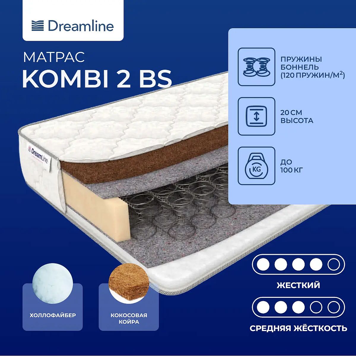 Высота, см: 20. Ограничение по максимальной нагрузке, кг: 100. Наполнение моделиОдна сторона матраса является жесткой и изготавливается на основе слоя кокосовой койры. Койра – это природный материал, гипоаллергенный и гигиеничный. Благодаря сухим волокнам он быстро испаряет влагу, а также хорошо проводит воздух. Кокос обеспечивает надежную поддержку для позвоночника и способствует естественному положению тела во время сна. Другая сторона изготавливается на основе чуть более мягкого наполнителя – холлофайбера. Это синтетический материал на основе пустотелых и скрученных волокон. Он придает матрасу упругость, а также обеспечивает благоприятный микроклимат на поверхности. Оба материала являются абсолютно безопасными.Особенности работы пружин BonnelВ основе модели проложен блок зависимых пружин «Боннель». Пружины в такой конструкции соединены друг с другом и создают надежную систему, которая поддерживает тело и способствует комфортному сну. Пружины выполнены из прочной стали, между ними имеются отверстия, благодаря чему такой блок постоянно проветривается и обеспечивается гигиеничное спальное место. Ко всему прочему такая конструкция стоит недорого.Жаккардовый чехолЧехол модели выполнен из хлопкового жаккарда Lux, простеганного на холлконе.Защита матрасаДля защиты от загрязнений, нежелательных пятен рекомендуем купить защитный наматрасник или водонепроницаемый чехол. Он сохранит поверхность чистой, а также продлит срок службы матраса.Другие моделиТакже вы можете посмотреть другие модели на блоке «Боннель»: Dreamline Kombi 3 BS, Dreamline Kombi 1 BS.