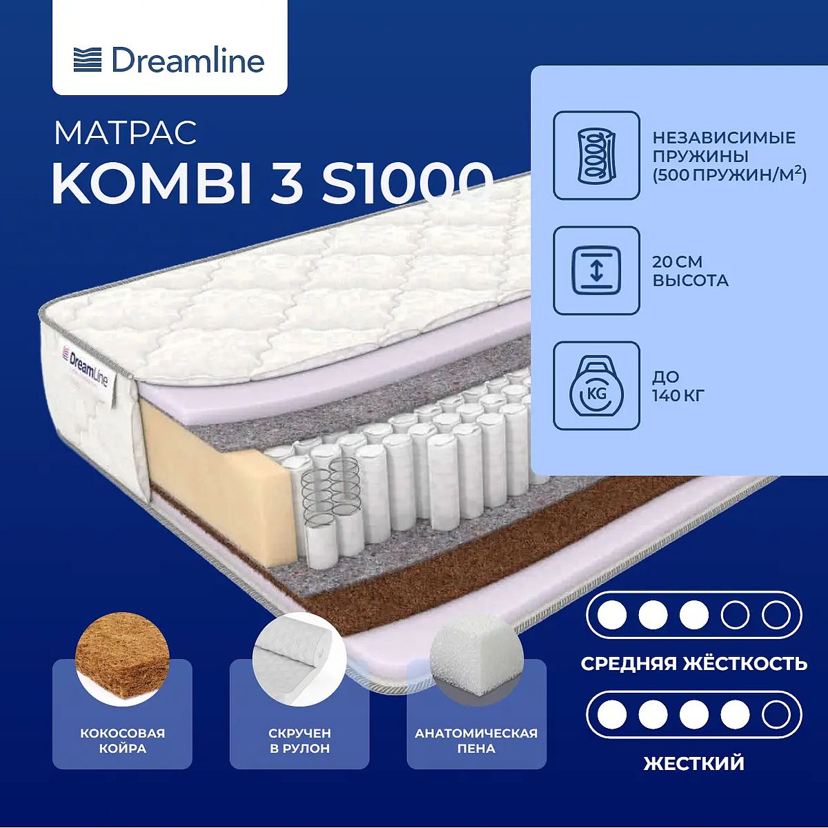 Высота, см: 20. Ограничение по максимальной нагрузке, кг: 140. Особенности работы пружин S1000Модель построена на блоке независимых пружин S1000. Такая конструкция характеризуется повышенным анатомическим эффектом. В ней по 500 микропружин расположены на 1 кв. метре. Каждая пружина заключена в отдельный чехол и работает самостоятельно. За счет того, что пружины разделены, они действуют только тогда, когда на них направлена нагрузка. Такое строение позволяет создать максимально комфортное спальное место.Наполнение моделиОдна сторона модели представлена слоем искусственного латекса, а другая изготовлена на основе кокосовой койры и искусственного латекса. Оба материала являются гипоаллергенными, они не содержат вредных примесей и запаха. Искусственный латекс создает умеренно-мягкую поверхность, которая обеспечивает релаксацию всего тела. Кроме того, снимает напряжение в различных частях тела, а также способствует восстановлению кровотока. Кокосовая койра делает латекс более жестким. Материал создает мощную основу для всего тела, позволяет позвоночнику принимать естественное положение во время сна, а также создает благоприятные условия для полноценного отдыха.Защита матрасаДля защиты от загрязнений, нежелательных пятен рекомендуем купить защитный наматрасник или водонепроницаемый чехол. Он сохранит поверхность чистой, а также продлит срок службы матраса.Скрутка в рулонПо умолчанию матрас поставляется в развернутом виде. По вашему желанию матрас может быть доставлен в скрученном виде.Другие моделиТакже вы можете посмотреть другие модели на блоке TFK: Dreamline Kombi 2 S1000, Dreamline Kombi 1 S1000.Подарок