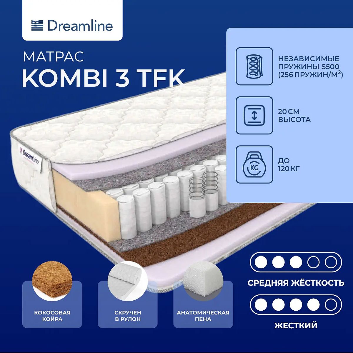 Высота, см: 20. Ограничение по максимальной нагрузке, кг: 120. Упругая поддержка для телаУмеренно-мягкая сторона выполнена на основе искусственного латекса. Это синтетический материал, полностью безопасный для здоровья человека. Искусственный латекс способствует расслаблению, снимает напряжение и создает упругую поддержку для тела. На его поверхности поддерживается оптимальный микроклимат.Сочетание кокоса и латексаСредне-жесткая сторона выполнена на основе кокосовой койры и искусственного латекса. Кокос добавляет жесткости, он максимально анатомичный и очень прочный. Кокос способен выдерживать большие нагрузки и не рассыхаться со временем. Материал обеспечивает надежную опору для всего тела, позволяет позвоночнику принимать правильное положение во время сна.Особенности работы пружин TFKОсновой для этой модели служит блок независимых пружин TFK. В такой конструкции по 256 микропружин расположено на 1 кв. метре. Пружины помещены в отдельные чехлы и равномерно распределяют нагрузки. Такой блок гарантирует хорошую поддержку всего тела и способствует созданию комфортной поверхности для сна.Жаккардовый чехолЧехол модели выполнен из хлопкового жаккарда Lux, простеганного на холлконе.Защита матрасаДля защиты от загрязнений, нежелательных пятен рекомендуем купить защитный наматрасник или водонепроницаемый чехол. Он сохранит поверхность чистой, а также продлит срок службы матраса.Скрутка в рулонПо умолчанию матрас поставляется в развернутом виде. По вашему желанию матрас может быть доставлен в скрученном виде.Другие моделиТакже вы можете посмотреть другие модели на блоке TFK: Dreamline Kombi 1 TFK, Dreamline Kombi 2 TFK.