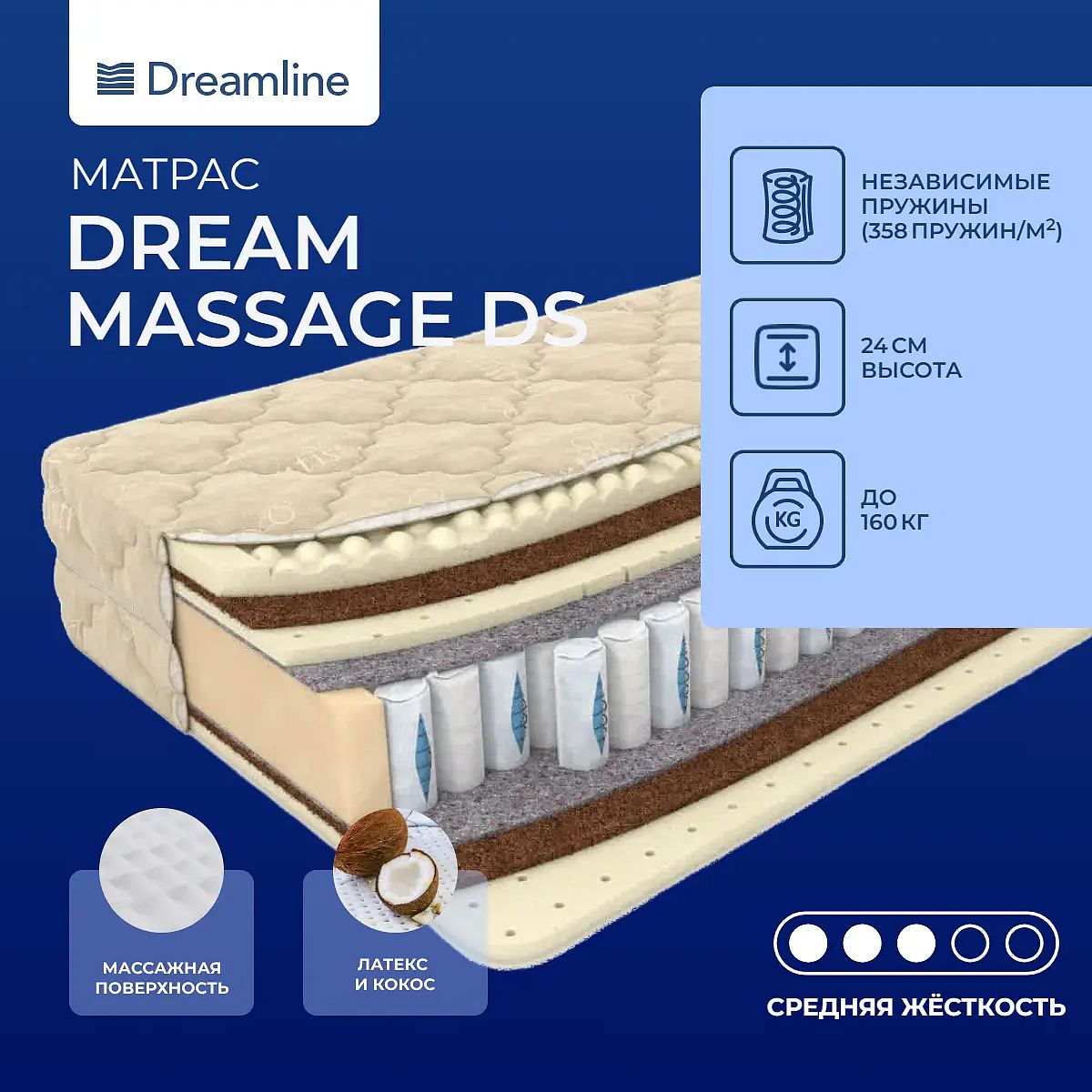 Матрас со съемным чехлом нельзя скрутить. Пружины для парDream Massage DS – комфортный матрас, который подходит для пар с большой разницей в весе.Пружины «Дуэт» – идеальное решение для парДело в том, что пружины, входящие в состав такого блока расположены в шахматном порядке: внутри более длинных пружин располагаются более короткие. Когда партнер с большим весом ложиться на матрас, сжимаются короткие пружины, а длинные начинают работать, когда ложиться партнер с меньшим весом.Наполнитель для расслабленияМодель с двусторонним наполнением. С одной стороны проложен слой латекса с массажным эффектом. Этот материал призван создать пространство релакса. Кроме того, он достаточно упругий, он словно мягкое облако обволакивает тело спящего.Сочетание кокоса и латексаДалее идет слой кокосовой койры и натурального латекса. Эти материалы дополняют друг друга: латекс наделяет спальное место упругостью и мягкостью, а кокос – жесткостью, он поддерживает тело и помогает принять правильное положение во время сна. С другой стороны проложен слой натурального латекса и кокоса.Велюровый чехолЧехол модели сшит из мягкой велюровой ткани Antistress.Защита матрасаДля защиты от пятен грязи, пыли или любой жидкости приобретайте защитный наматрасник–чехол или водонепроницаемый наматрасник. Он заметно продлит срок службы матраса.Другие моделиВы можете посмотреть похожую модель на улучшенном пружинном блоке «Дуэт» – Paradise Massage DS и Relax Massage DS.