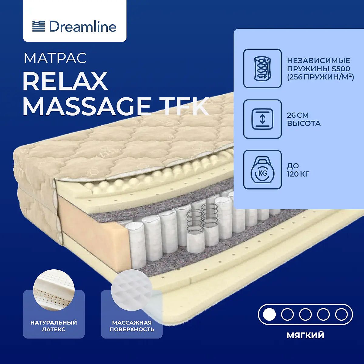 Матрас со съемным чехлом нельзя скрутить. Умеренно–мягкая модель на основе латекса. Работа пружин TFKВ центре конструкции – блок независимых пружин TFK: здесь каждая пружина находится в специальном чехле из нетканого материала – спанбонда. При надавливании на поверхность прогибаются только пружины, получающие давление. Это гарантирует равномерное распределение нагрузки.Полное расслаблениеНаличие латекса с массажным эффектом подчеркивает принадлежность модели к массажным матрасам. Поверхность материала неровная, с бугорками. Она и весь материал в целом создают микромассажный эффект и гарантируют полное расслабление во время сна.Чехол матрасаЧехол матраса мягкий и приятный на ощупь велюр Antistress.Защита матрасаДля защиты матраса от загрязнений и влаги рекомендуем докупить также защитный наматрасник–чехол и водонепроницаемый наматрасник.Другие моделиВозможно, вас могут заинтересовать и другие модели этой серии: Relax Massage S1000, Relax Massage S2000, Relax Massage DS.