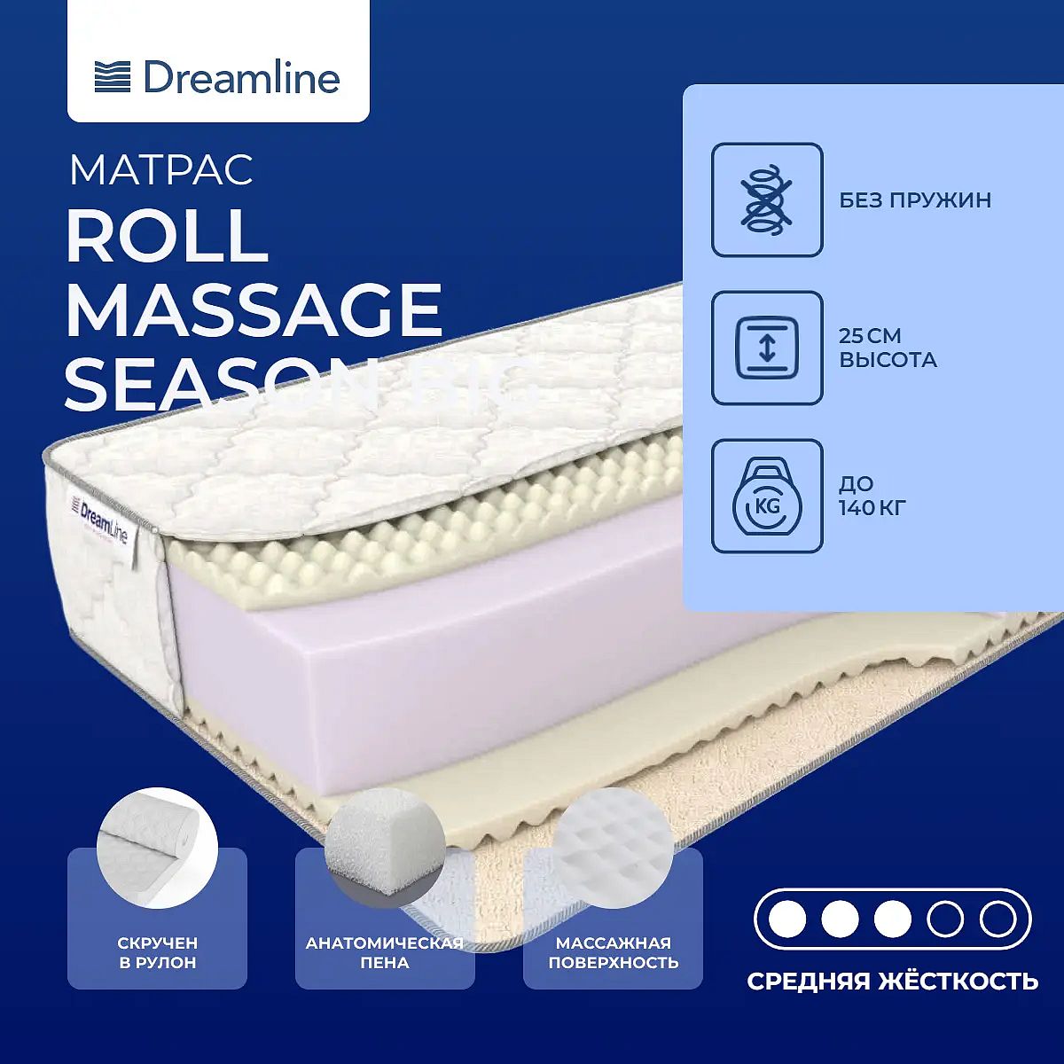 Матрас «DreamLine Roll Massage Season BIG» — средней жесткости, которая комфортна большинству людей среднего телосложения. Это — оптимальный вариант и детям, и взрослым, и пожилым людям.
