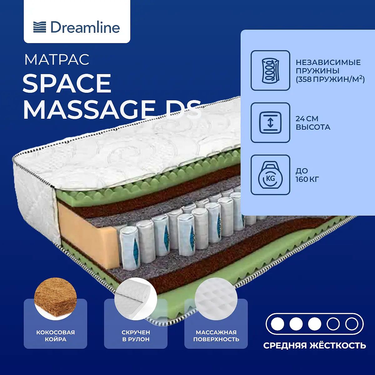 Матрас «DreamLine Space Massage DS» — средней жесткости, которая комфортна большинству людей среднего телосложения. Это — универсальный выбор и детям, и взрослым, и пожилым людям.