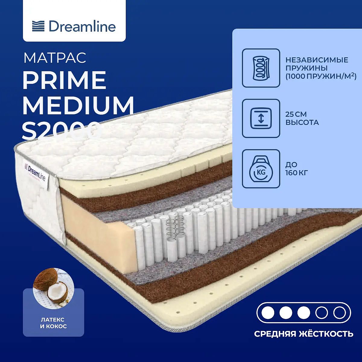 Качественный матрас на премиальном блоке пружин S2000. Блок независимых пружинВ основе блока 2000 микропружин на спальное место. Каждая пружина имеет форму бочонка и упакована в специальный чехол из прочного и износостойкого материала – спанбонда. Пружины изолированы друг от друга, притом действуют автономно одна от другой. Такое строение обеспечивает равномерное распределение нагрузки и точечное воздействие на тело спящего.Материалы матрасаВ составе матраса – уложенные с двух сторон слои кокосовой койры и натурального латекса. Оба материалы натуральные и гипоаллергенные. Кокос - природный материал повышенной жесткости, он заставляет позвоночник находиться в правильном положении. Латекс - мягкий и упругий материал, нежно обволакивает тело спящего.Хлопковый чехолЧехол матраса изготавливается из хлопкового жаккарда.Защита матрасаДля дополнительной защиты спальной поверхности от грязи и пыли купите также защитный наматрасник-чехол или водонепроницаемый наматрасник.Другие моделиМодель средне-жесткая, то есть матрас не жесткий и не мягкий. Также вы можете посмотреть другую модель на другом пружинном блоке - Dreamline Prime Medium DS.