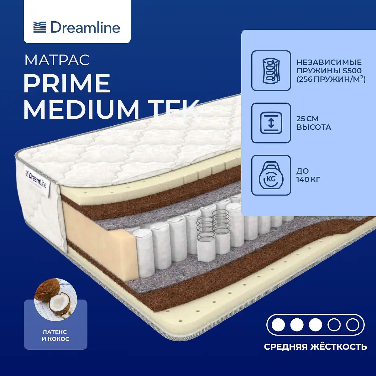Высокий матрас на независимых пружинах TFK. 256 пружин на одном кв. метреВ блоке TFK все пружины изготавливаются в форме маленьких цилиндров, они изолированы друг от друга и помещены в специальные индивидуальные чехлы из спанбонда. В блоке 256 пружин на одном кв. метре и каждая работает отдельно от другой.Материалы моделиНаполнение матраса – премиальное. В качестве материалов выбраны кокосовая койра и натуральный латекс. Кокос наделяет спальную поверхность повышенной жесткостью и служит отличной поддержкой для позвоночника. Натуральный латекс мягко обволакивает тело спящего и создает на поверхности дополнительный комфорт.Чехол из жаккардаЧехол матраса изготавливается из хлопкового жаккарда.Другие моделиДля дополнительной защиты спальной поверхности от грязи и пыли купите также защитный наматрасник-чехол или водонепроницаемый наматрасник.Другие моделиМодель средне-жесткая, то есть матрас не жесткий и не мягкий. Также вы можете посмотреть и другие модели, имеющие среднюю жесткость, на других пружинных блоках - Dreamline Prime Medium S1000, Dreamline Prime Medium S2000, Dreamline Prime Medium DS.