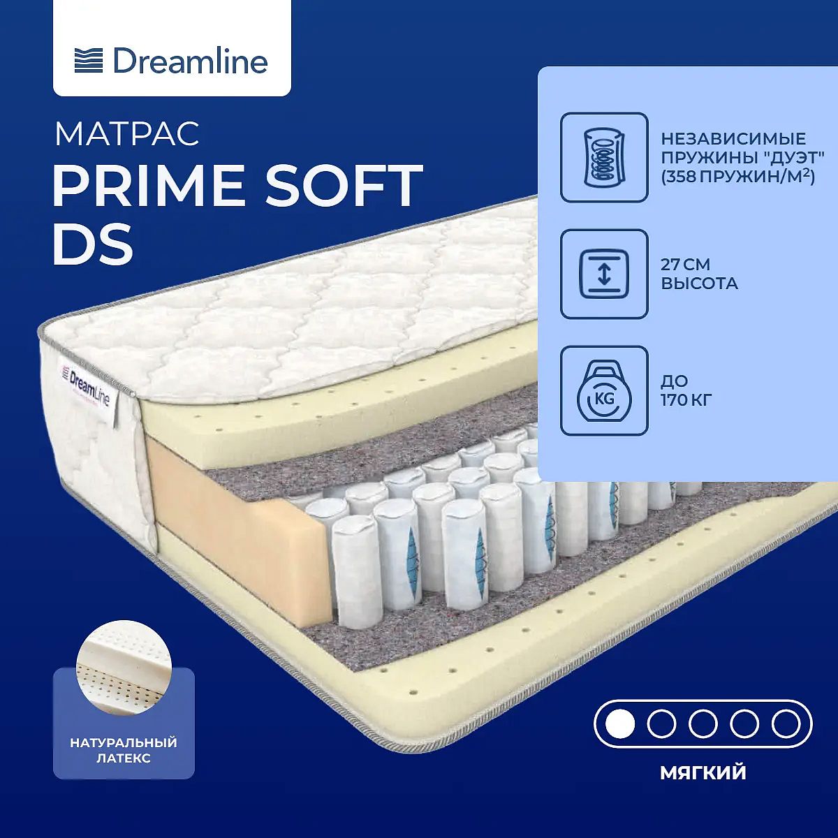 Модель премиум-класса на пружинном блоке «Дуэт». 358 микропружин на кв. метрВ таком блоке 358 микропружин на один кв. метр, каждая помещена в отдельный чехол из износостойкого материала. Пружины двух видов: маленького и большого диаметра. Одни для партнера потяжелее, а другие для партнера с весом средним или ниже среднего. Такие пружины идеальны для пар с разницей в весе.Пористый наполнительНаполнителем модели служит натуральный латекс. Это пористый материал с дышащей поверхностью, очень эластичный и упругий. Он отлично смягчает поверхность и делает ее комфортной.Чехол из жаккардаЧехол выполнен из мягкого и прочного хлопкового жаккарда.Защита моделиДля защиты поверхности от нежелательных пятен и пыли рекомендуем докупить защитный наматрасник-чехол или водонепроницаемый наматрасник.Другие моделиВы также можете посмотреть модель с латексом на блоке «Дуэт» - Dreamline Prime Medium DS.