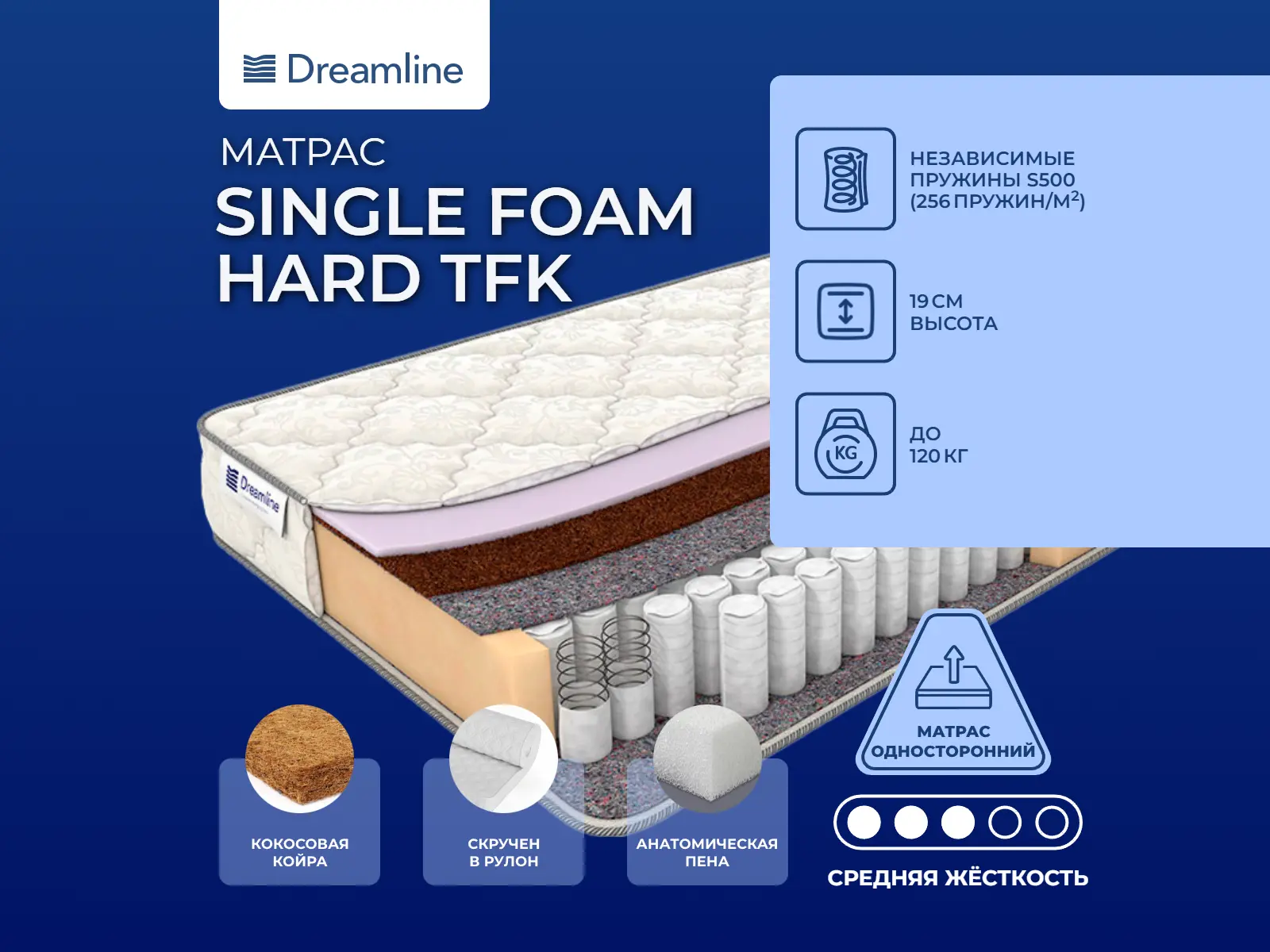Средне-жесткая модель с искусственным латексом и кокосом на пружинах TFK. Универсальная жесткостьЖесткость модели универсальная, не слишком жесткая или мягкая. Подойдет на любой вкус.Наполнители моделиМатрас имеет одну спальную сторону, она изготавливается на основе кокоса и искусственного латекса. Кокос - твердый наполнитель, он поддерживает слои и предохраняет от износа всю конструкцию. Латекс – упругий и износостойкий материал.Точечная работа пружинОснова модели – пружинный блок TFK. В нем находится большое количество микропружин, причем каждая помещена в индивидуальный тканевый чехол. Это гарантирует равномерное распределение нагрузки и точечное воздействие пружин. По обеим сторонам модели расположены слои термовойлока. Они препятствуют выпадению пружин из блока, а также осуществляют терморегуляцию внутри всего изделия.Чехол матрасаЧехол выполнен из хлопкового жаккарда, приятного на ощупь.Защита матрасаДля того, чтобы защитить поверхность матраса от загрязнений, пыли рекомендуем купить защитный наматрасник-чехол . Он сохранит поверхность чистой, а также продлит срок службы самого матраса.Скрутка в рулонПо умолчанию матрас поставляется в развернутом виде. По вашему желанию матрас может быть доставлен в скрученном виде.Другие моделиВы можете посмотреть другие модели c холлофайбером - Dreamline Single Hol TFK, Dreamline Single Hol Hard TFK.
