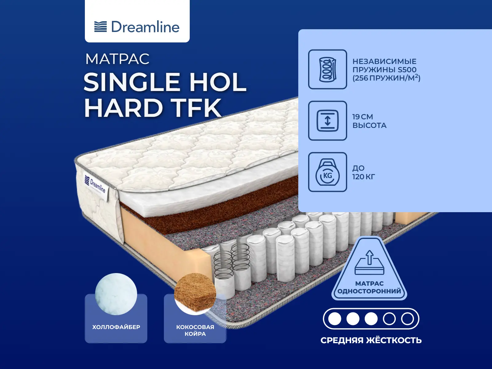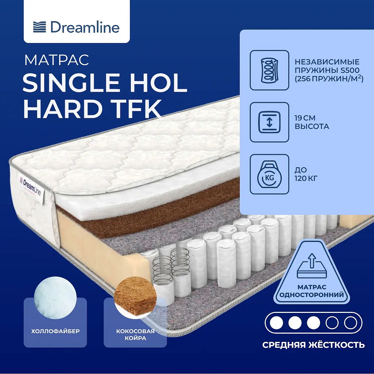 Матрас с холлойфайбером и кокосовой койрой на пружинах TFK. Индивидуальные пружиныTFK – это конструкция, в которой каждая пружина помещена в специальный тканевый мешочек из спанбонда. Прогибаются они только в том случае, ели нагрузка направлена на них. Благодаря такому строению нагрузка распределяется равномерно и точечно. Обе стороны пружинного блока прикрыты слоями термовойлока. Он препятствует выпиранию пружин.Сочетание кокоса и холлофайбераСпальная сторона выполнена на основе сочетания холлофайбера и кокоса. Плотные спиралевидные волокна в составе холлофайбера придают плотность и износостойкостью материалу. А жесткие волокна кокоса – прочность и большой эксплуатационный срок.Прочный чехолЧехол модели выполнен из плотного и приятного на ощупь хлопкового жаккарда.Защита матрасаДля того, чтобы защитить поверхность матраса от загрязнений, пыли рекомендуем купить защитный наматрасник-чехол . Он сохранит поверхность чистой, а также продлит срок службы самого матраса.Другие моделиВы можете посмотреть другие модели c холлофайбером - Dreamline Single Hol TFK и более мягкую - Dreamline Single Foam Hard TFK.