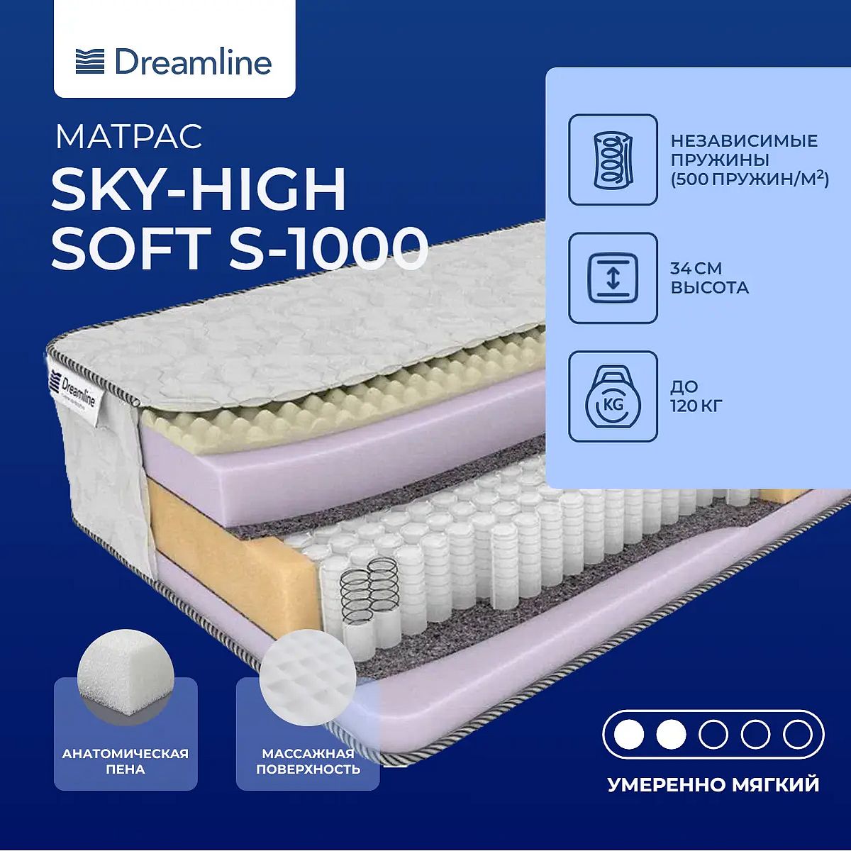 Средне-мягкий матрас «DreamLine Sky-high Soft S-1000» просто создан для настоящего ценителя комфорта. Такая модель хорошо подходит людям с небольшим весом.