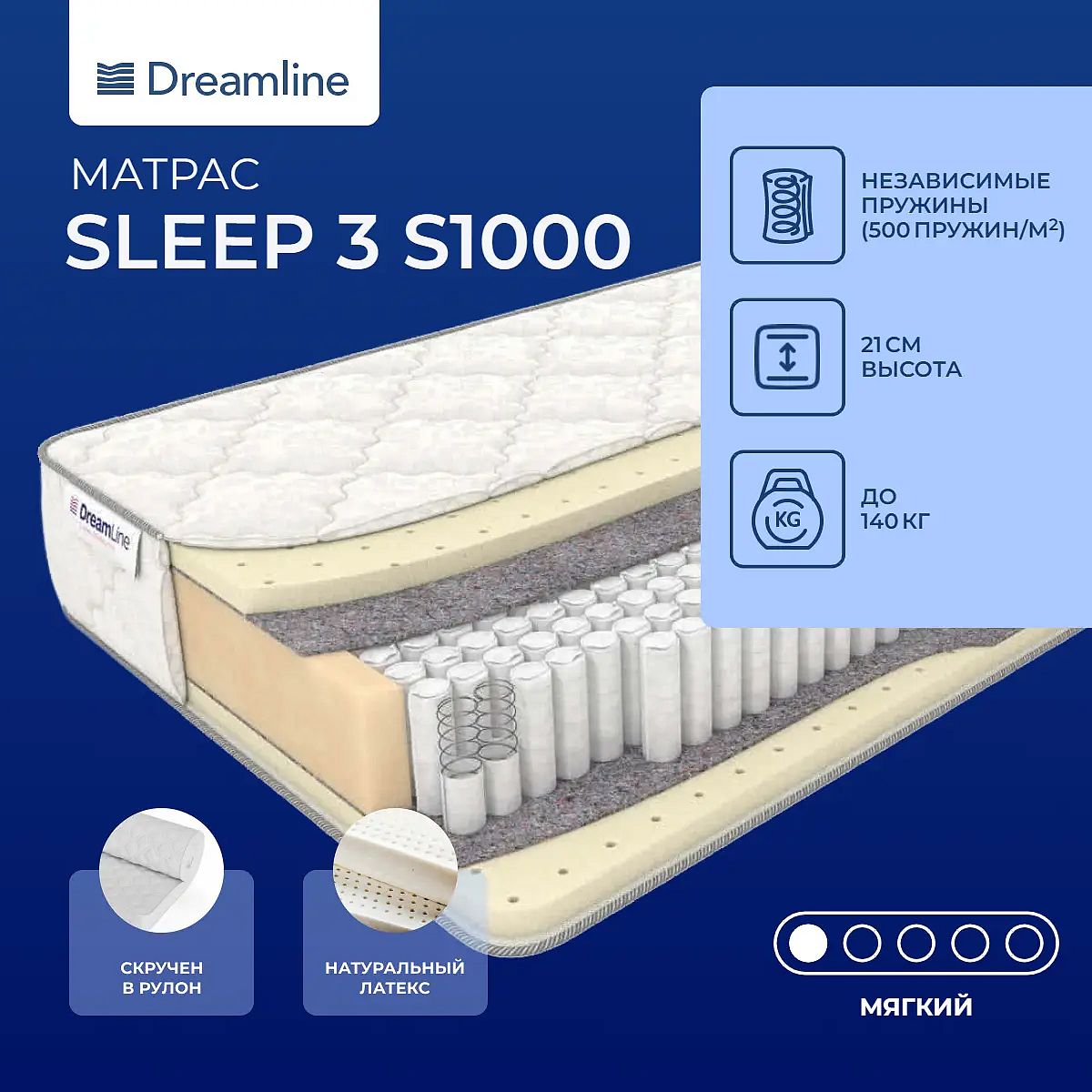Высота, см: 21. Ограничение по максимальной нагрузке, кг: 140. Особенности работы пружин S1000В основе модели проложен пружинный блок с высоким анатомическим эффектом и правильным распределением элементов. Это независимый пружинный блок S1000. В такой конструкции по 500 микропружин расположены на 1 кв. метре поверхности, пружины имеют одинаковую форму и размер и помещены в отдельные чехлы из износостойкого материала. Благодаря такому строению гарантируется полное расслабление и воздействие пружин на каждую точку тела спящего. Поэтому такой блок обладает высокой степенью поддержки.Наполнение моделиМатериалом служит натуральный латекс - материал, обладающий пониженной мягкостью и повышенным уровнем комфортности. Он имеет способность подстраиваться под все изгибы тела и повторять их, материал, словно облако, окутывает тело и способствует расслаблению и снятию напряжения. Латекс абсолютно безопасен для здоровья и не содержит токсины.Жаккардовый чехолЧехол модели выполнен из хлопкового жаккарда Lux и простеган на холлконе.Защита матрасаДля защиты от загрязнений, нежелательных пятен рекомендуем купить защитный наматрасник или водонепроницаемый чехол. Он сохранит поверхность чистой, а также продлит срок службы матраса.Скрутка в рулонПо умолчанию матрас поставляется в развернутом виде. По вашему желанию матрас может быть доставлен в скрученном виде.Другие моделиТакже вы можете посмотреть другую модель с похожим наполнением на блоке S1000 - Dreamline Sleep 2 S1000.Подарок
