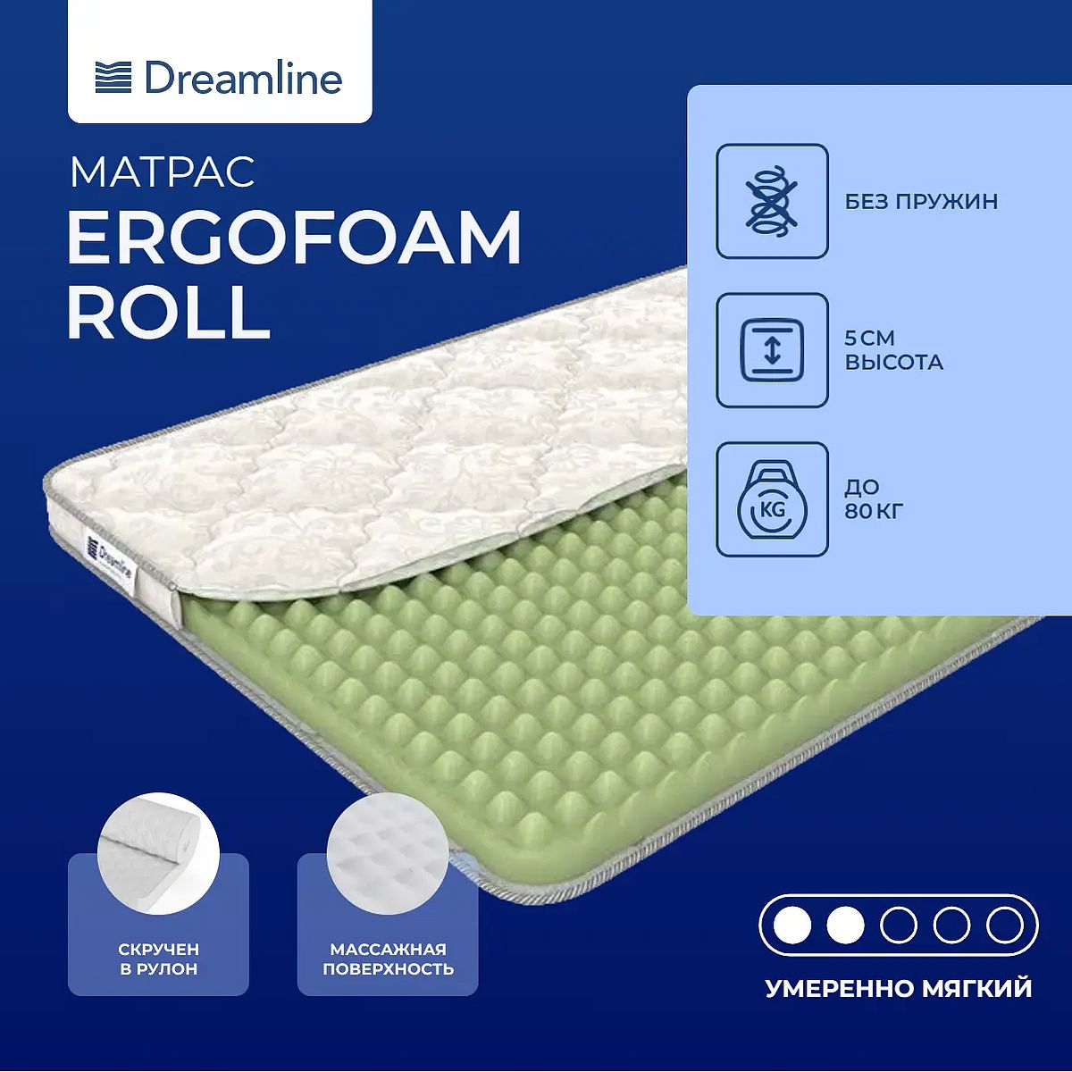 Средне-мягкий матрас «DreamLine ErgoFoam Roll» — для настоящего ценителя комфорта. Такой вариант хорошо подходит людям с небольшим весом.