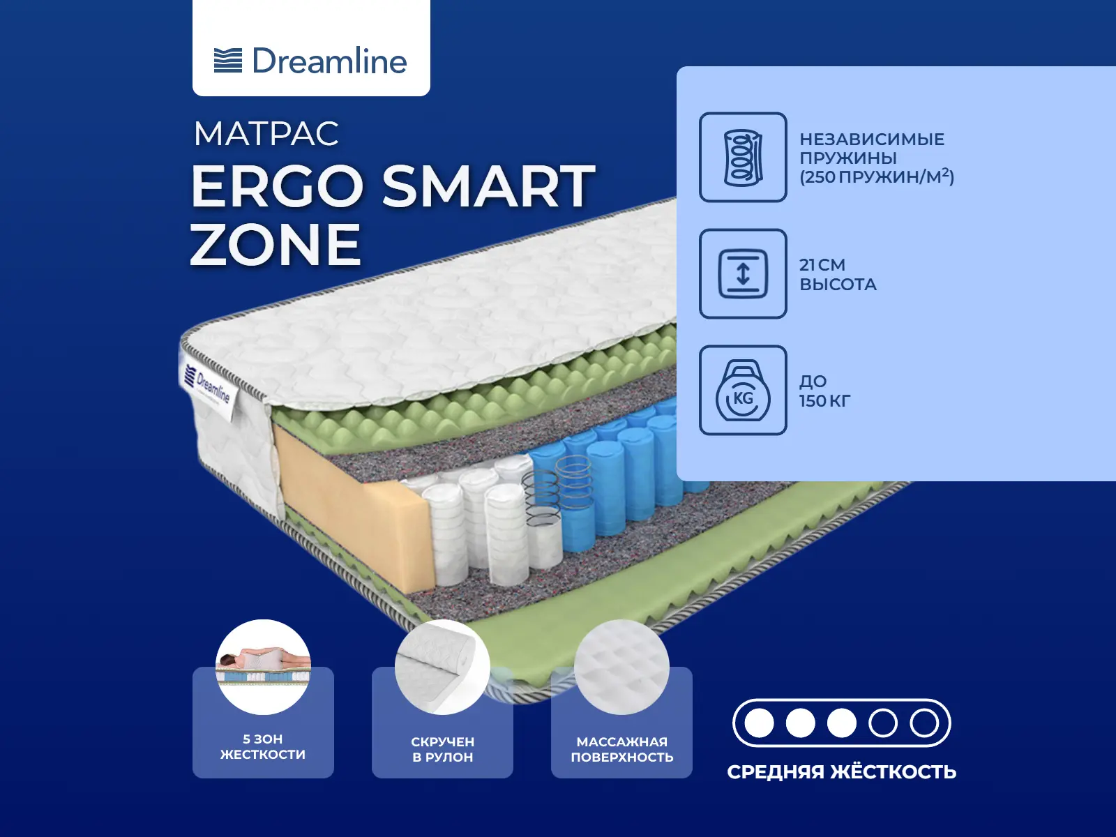 Матрас на зональном блоке пружин с микромассажным эффектом. Пятизональная поддержкаВ основе модели – пятизональный пружинный блок с разработанным плечевым и поясничным поясом пружин. Пружины имеют маленький размер и помещены в индивидуальные тканевые чехлы. Такой пружинный блок обеспечивает поддержку всего тела по зонам.Массажный наполнительВ качестве наполнителя используется ортопедическая пена с массажным эффектом – Ergo Foam. Она хорошо расслабляет и делает поверхность упругой и эластичной.Трикотажный чехолЧехол модели выполнен из мягкого и приятного на ощупь трикотажа.Защита матрасаДля защиты от загрязнений, нежелательных пятен рекомендуем купить защитный наматрасник-чехол или водонепроницаемый наматрасник.Скрутка в рулонПо умолчанию матрас поставляется в развернутом виде. По вашему желанию матрас может быть доставлен в скрученном виде.Другие моделиМодель имеет среднюю жесткость – верное решение для тех, кто не может определить, какой нужен матрас – жесткий или мягкий. Также вы можете посмотреть другую модель с кокосовой койрой – Dreamline Ergo Foam Smart Zone, а также модель помягче с латексом – Dreamline Sleep Smart Zone.