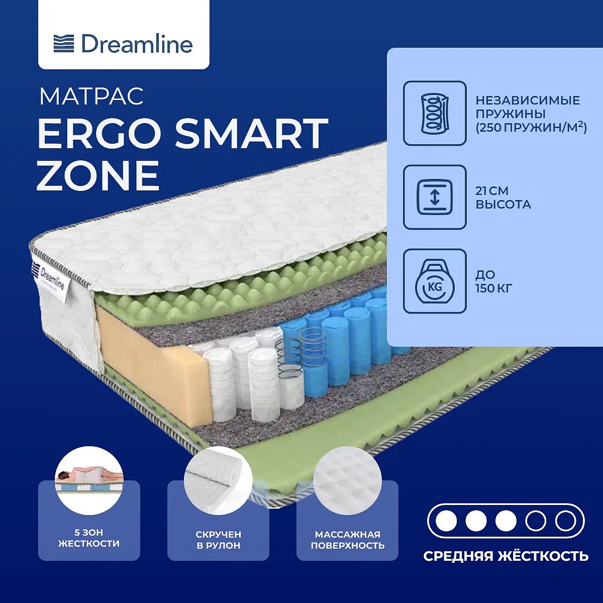 Матрас на зональном блоке пружин с микромассажным эффектом. Пятизональная поддержкаВ основе модели – пятизональный пружинный блок с разработанным плечевым и поясничным поясом пружин. Пружины имеют маленький размер и помещены в индивидуальные тканевые чехлы. Такой пружинный блок обеспечивает поддержку всего тела по зонам.Массажный наполнительВ качестве наполнителя используется ортопедическая пена с массажным эффектом – Ergo Foam. Она хорошо расслабляет и делает поверхность упругой и эластичной.Трикотажный чехолЧехол модели выполнен из мягкого и приятного на ощупь трикотажа.Защита матрасаДля защиты от загрязнений, нежелательных пятен рекомендуем купить защитный наматрасник-чехол или водонепроницаемый наматрасник.Скрутка в рулонПо умолчанию матрас поставляется в развернутом виде. По вашему желанию матрас может быть доставлен в скрученном виде.Другие моделиМодель имеет среднюю жесткость – верное решение для тех, кто не может определить, какой нужен матрас – жесткий или мягкий. Также вы можете посмотреть другую модель с кокосовой койрой – Dreamline Ergo Foam Smart Zone, а также модель помягче с латексом – Dreamline Sleep Smart Zone.