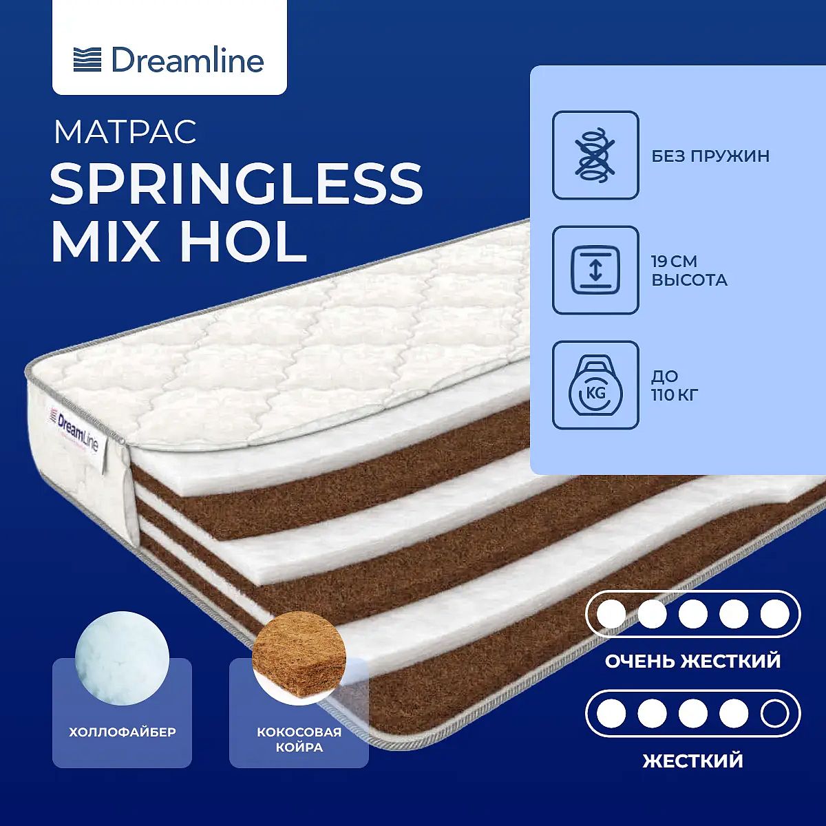 Сочетание холлофайбера и кокосаDreamline Mix Hol – беспружинная модель, состоящая из чередующихся слоев холлофайбера и кокосовой койры.Искусственный и прочный материалХоллофайбер является достаточно экономичным материалом, нередко его используют вместо кокосовой койры. Это умеренно-жесткий наполнитель, обладающий высокой прочностью и надежностью. Холлофайбер – материал искусственный, поэтому он экологически чистый и прекрасно подходит для аллергиков.Натуральный жесткий материалКокосовая койра – природный жесткий наполнитель, особо прочный, способный служить в течение достаточно долгого эксплуатационного срока. Кроме того, кокос отлично вентилируется, благодаря чему в нем исключается риск развития различных бактерий и влаги.Удобный чехол с рисункомЧехол выполнен из комфортного жаккарда, простеганного на холлконе. Имеет красивый рисунок.Защита матрасаРекомендуем приобретать защитный наматрасник, он позволит поверхности матраса оставаться чистой и надолго сохранять свежесть.Другие моделиМатрас двусторонний: умеренно-жесткий с одной стороны и жесткий - с другой. Если вас интересует модель помягче, тогда рекомендуем посмотреть двустороннюю модель Dreamline Mix Slim.