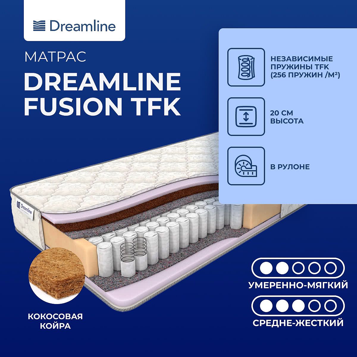 Кокос — натуральный материал, койра отлично дышит, придает матрасу «Fusion TFK» жесткость и упругость.